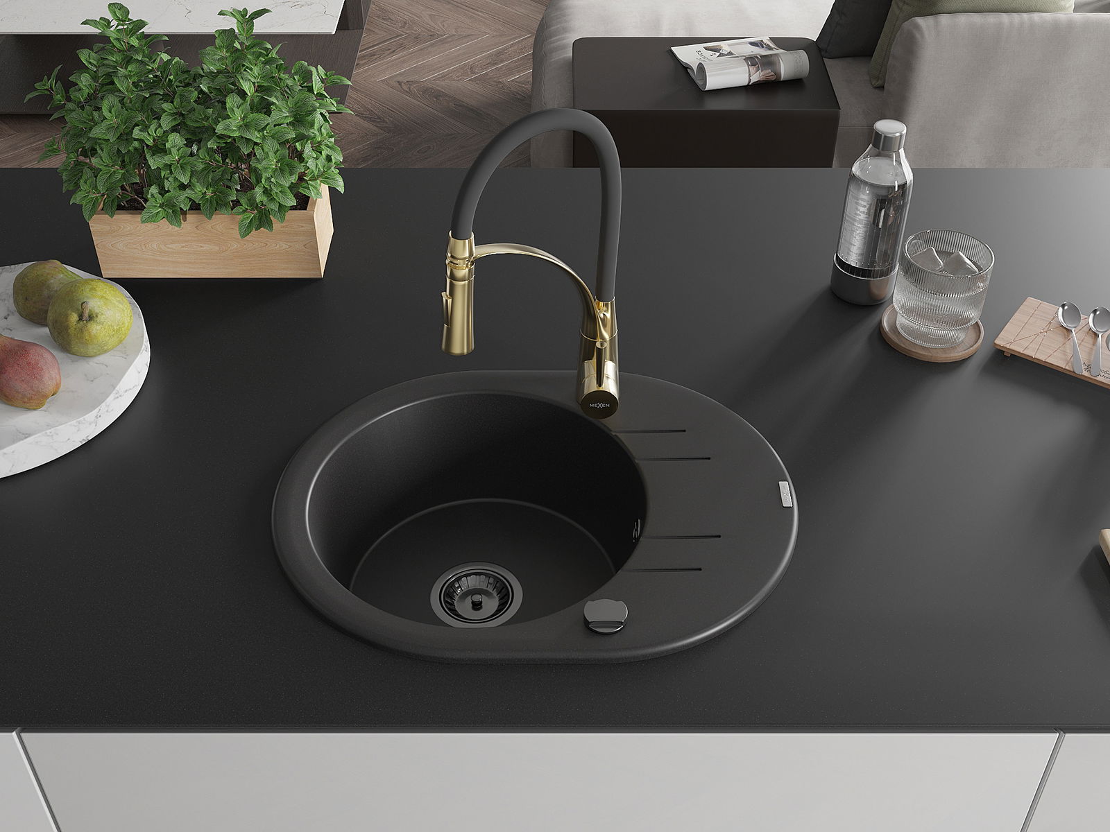 Мивката е направена от висококачествен гранит. Това е елегантно и най -вече практично допълнение към всяка кухня, независимо от нейния стил. Висококачествената и гранитна издръжливост осигуряват много години употреба.