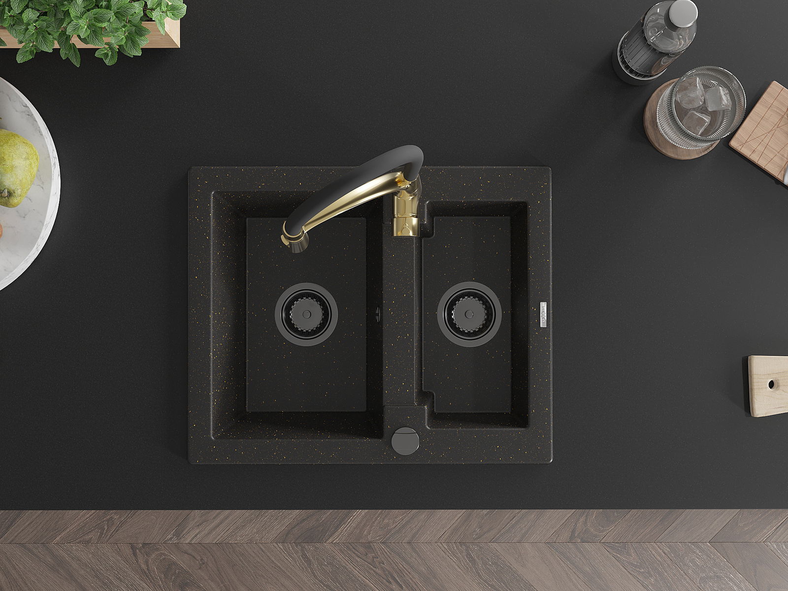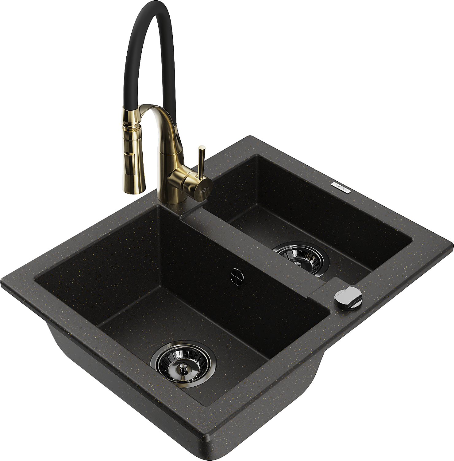 Mexen Carlos гранитна мивка с 1,5 камери и кухненски смесител Aster, черен/златен металик - 6518-75-73450-57-B