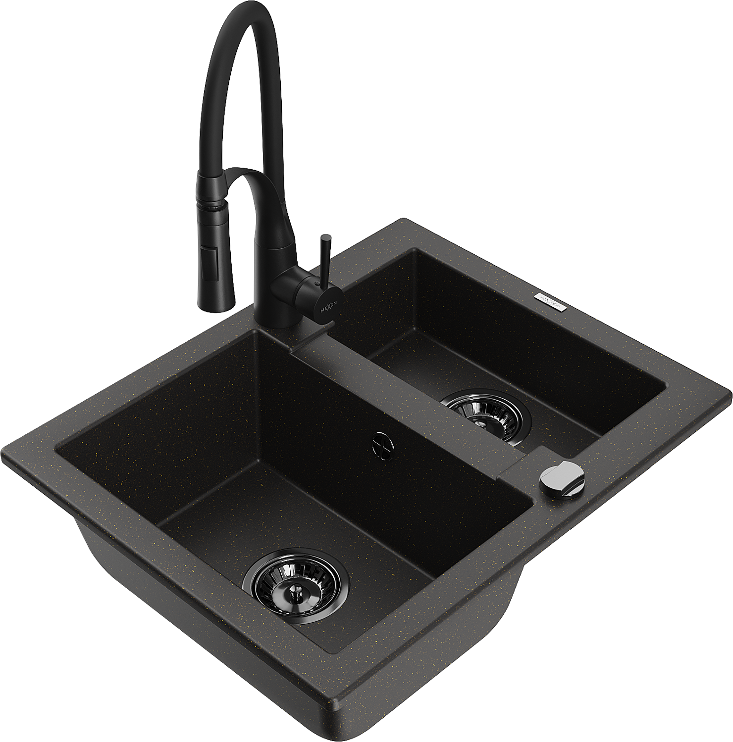 Mexen Carlos гранитна мивка 1,5-камерна с кухненски смесител Aster, черен/златист металик - 6518-75-73450-70-B