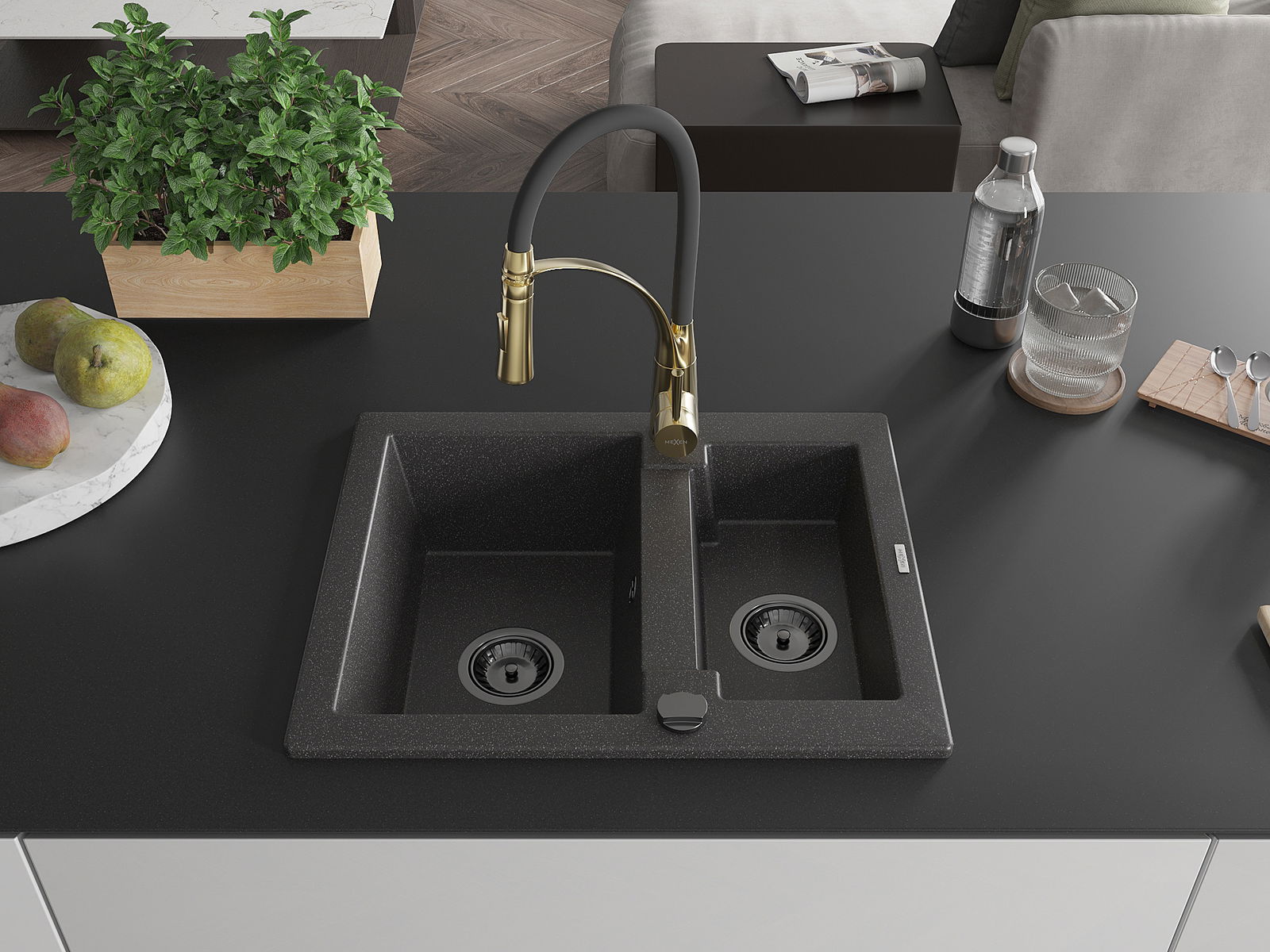 Mexen Carlos гранитна мивка 1,5-камерна с кухненски смесител Aster, черно напрашено - 6518-76-73450-57-B