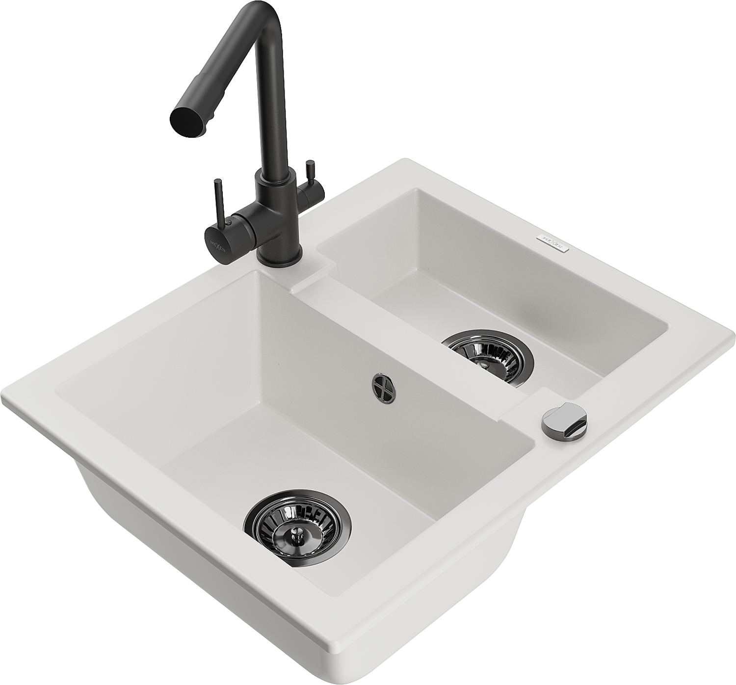 Mexen Carlos гранитна мивка 1,5-камерна с кухненски смесител Duero, бял - 6518-20-671600-70