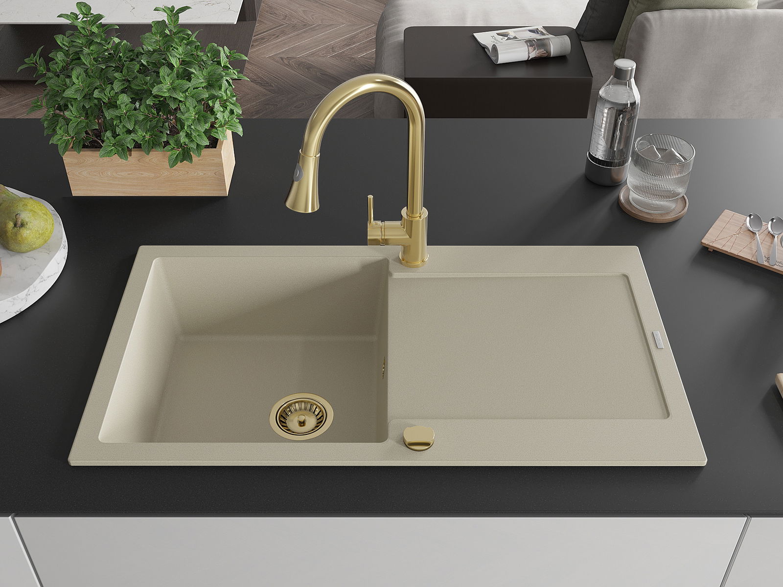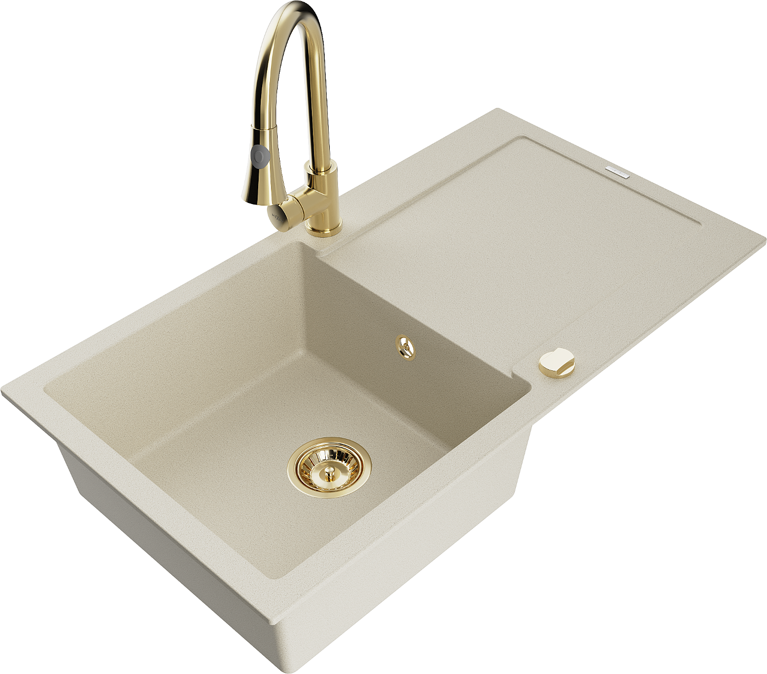 Mexen Leo мивка от гранит с 1 отделение, с отцедник и кухненски смесител Elia, бежов - 6501-69-670101-50