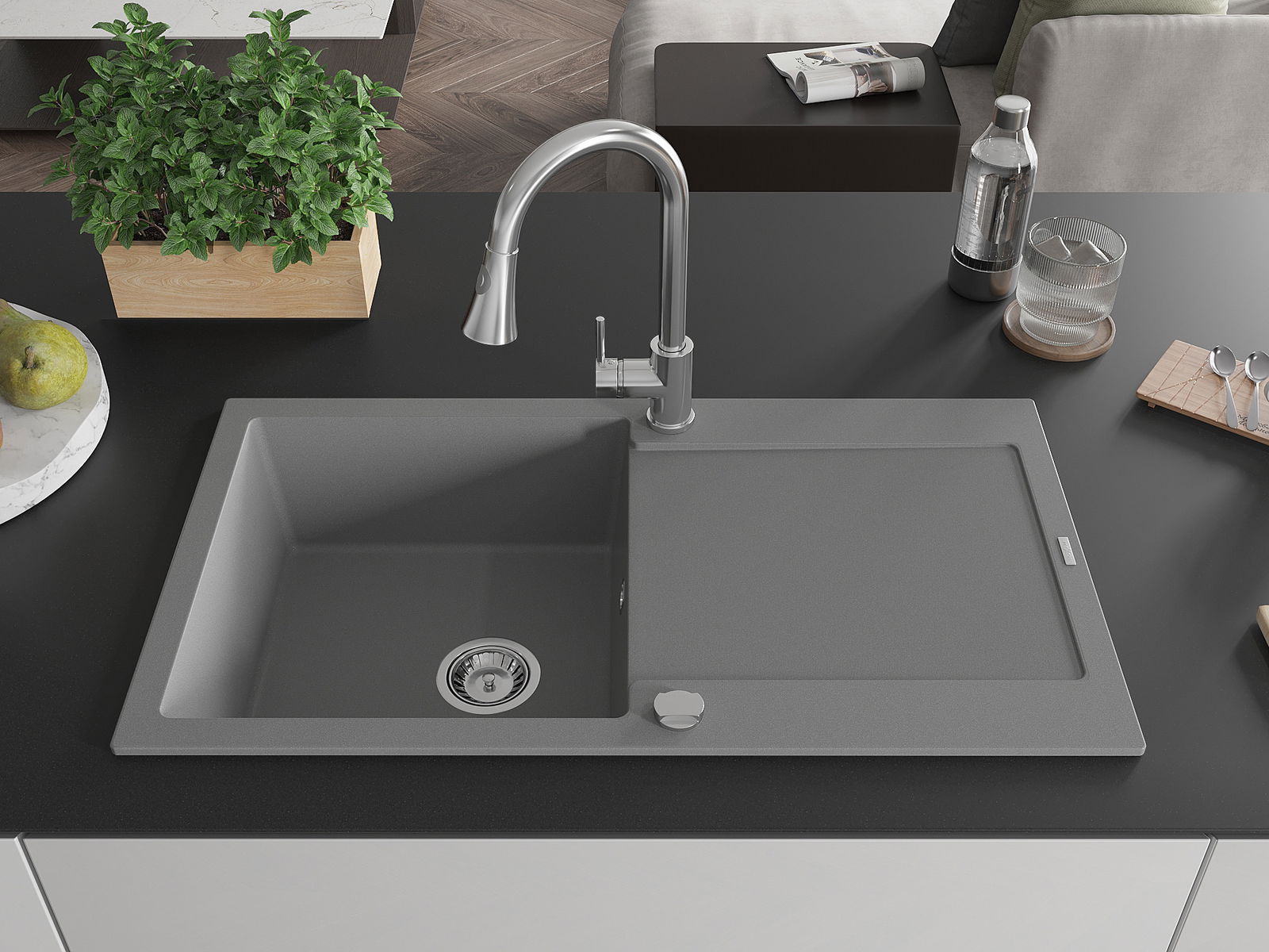 Мивката е направена от висококачествен гранит. Това е елегантно и най -вече практично допълнение към всяка кухня, независимо от нейния стил. Висококачествената и гранитна издръжливост осигуряват много години употреба.