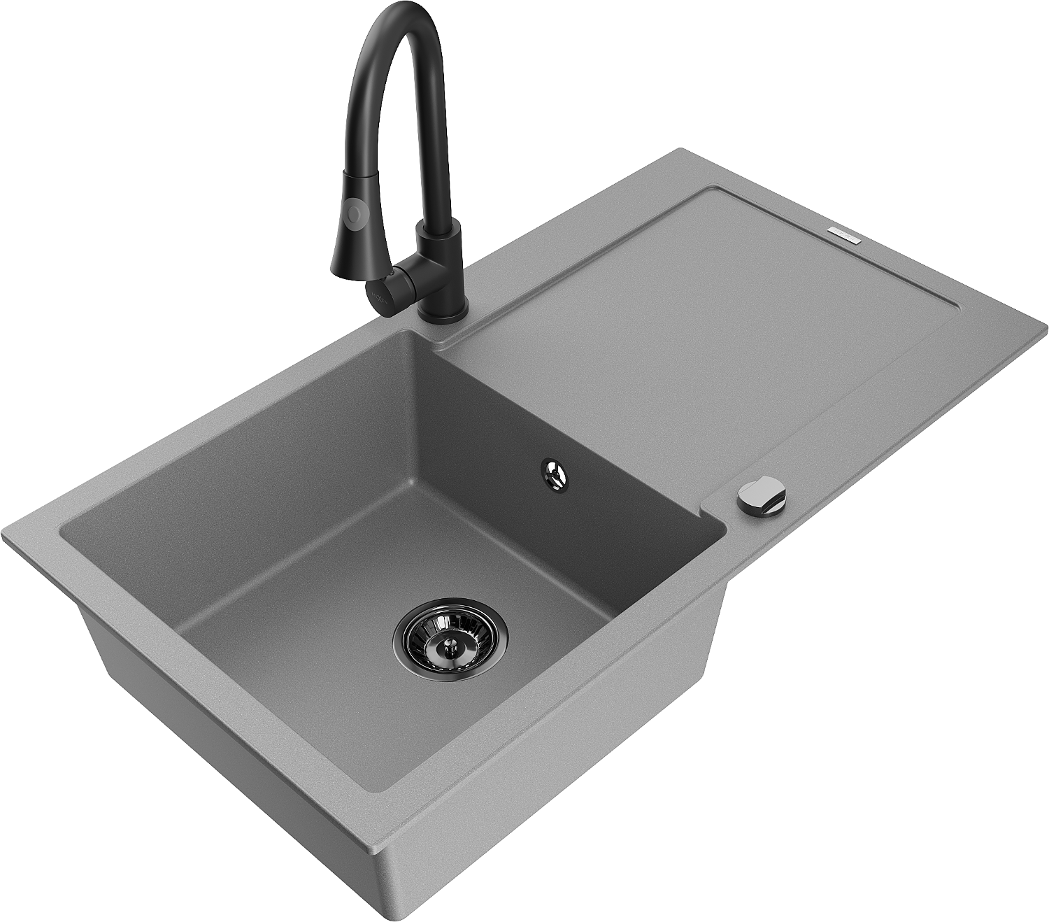 Mexen Leo гранитна мивка с 1 отделение и отцедник и кухненски смесител Elia, сив - 6501-71-670101-70-B
