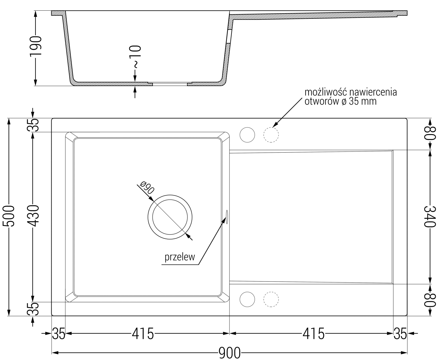 Мивката разполага с 2 предварително фрезовани отвора с диаметър 35 мм, които могат да бъдат собственоръчно пробити. Те могат да се използват, наред с другото, за монтаж на дозатор за течност, който ще елиминира присъствието на пластмасови бутилки в кухнята и ще придаде елегантен завършек.