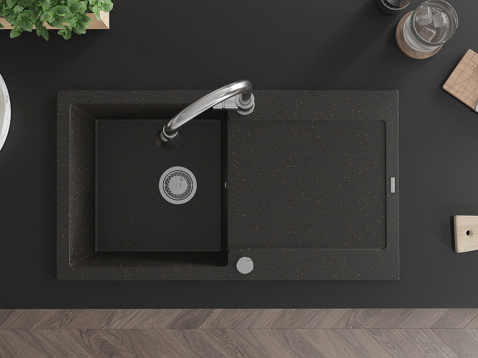 Mexen Leo гранитна мивка 1-камерна с изцедник и кухненски смесител Elia, черно/златен металик - 6501-75-670101-00