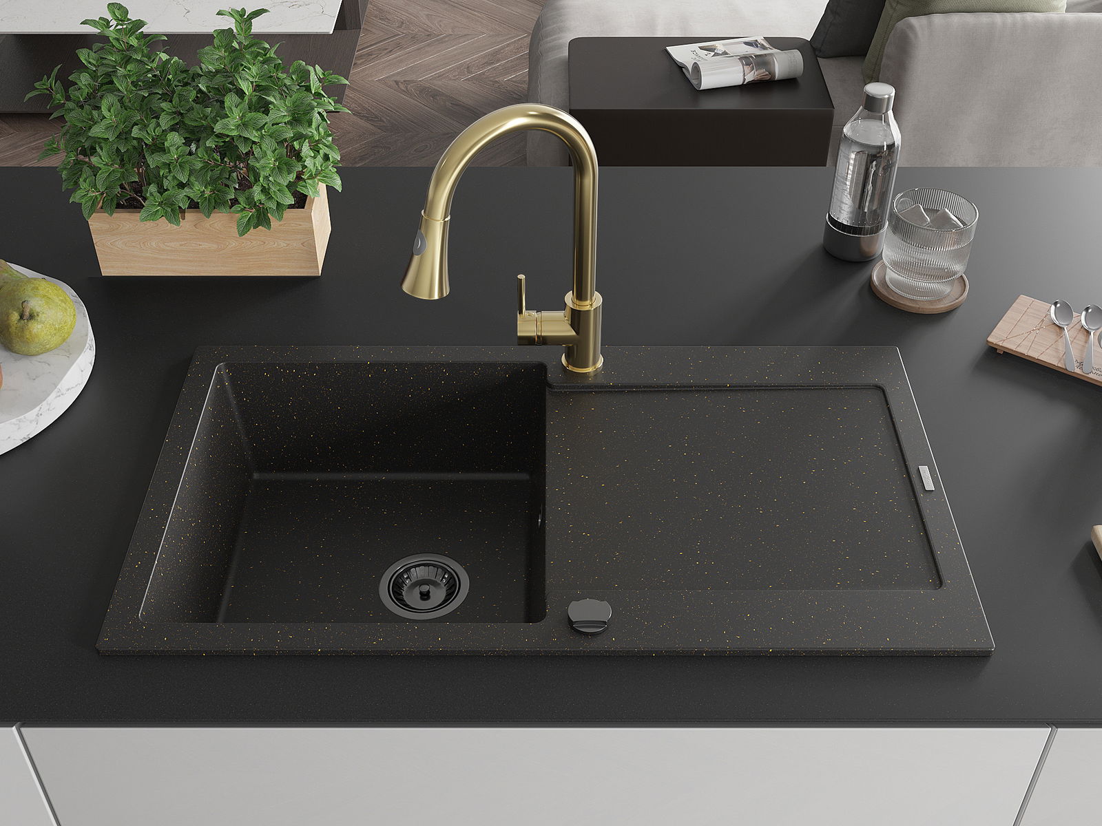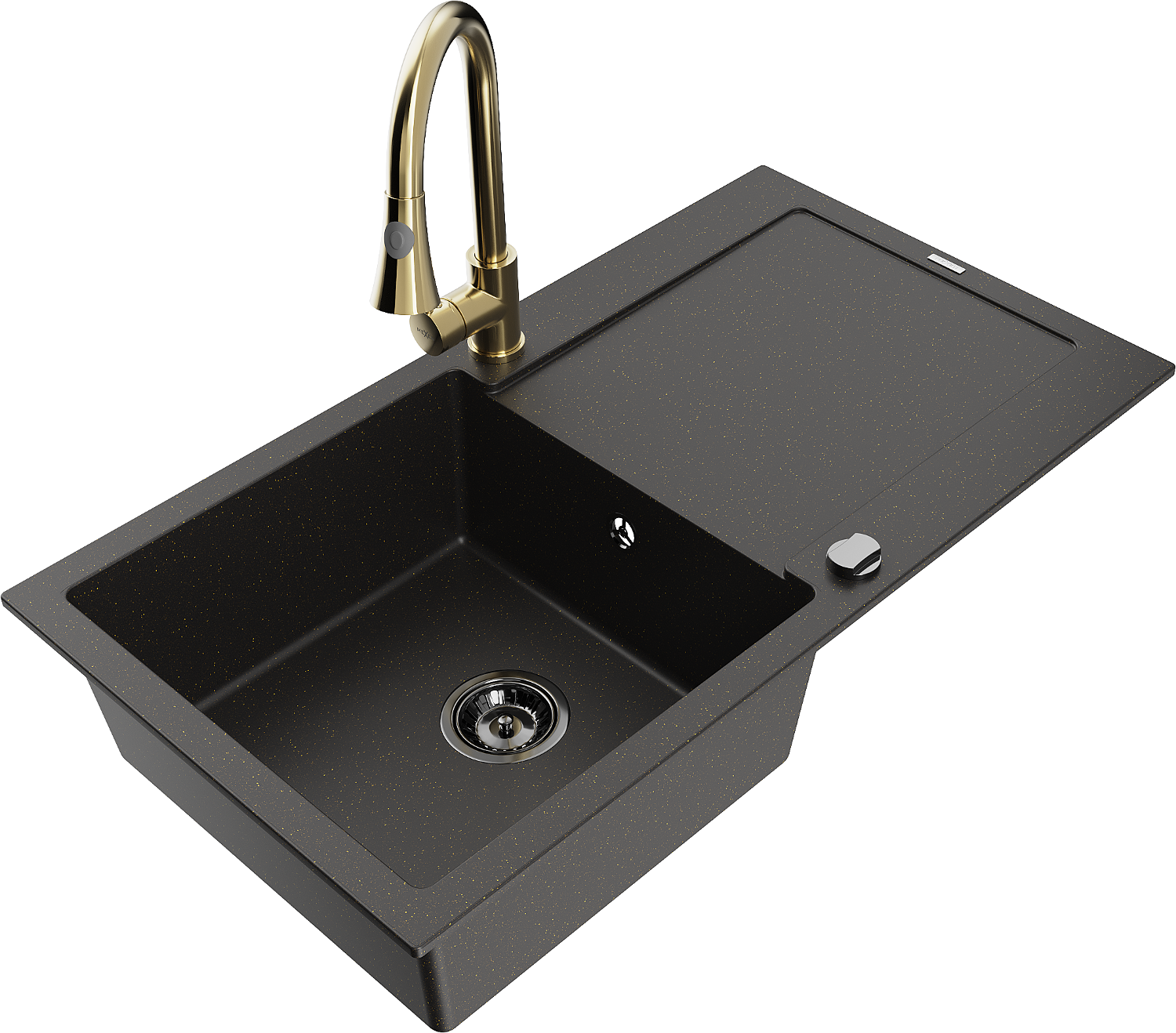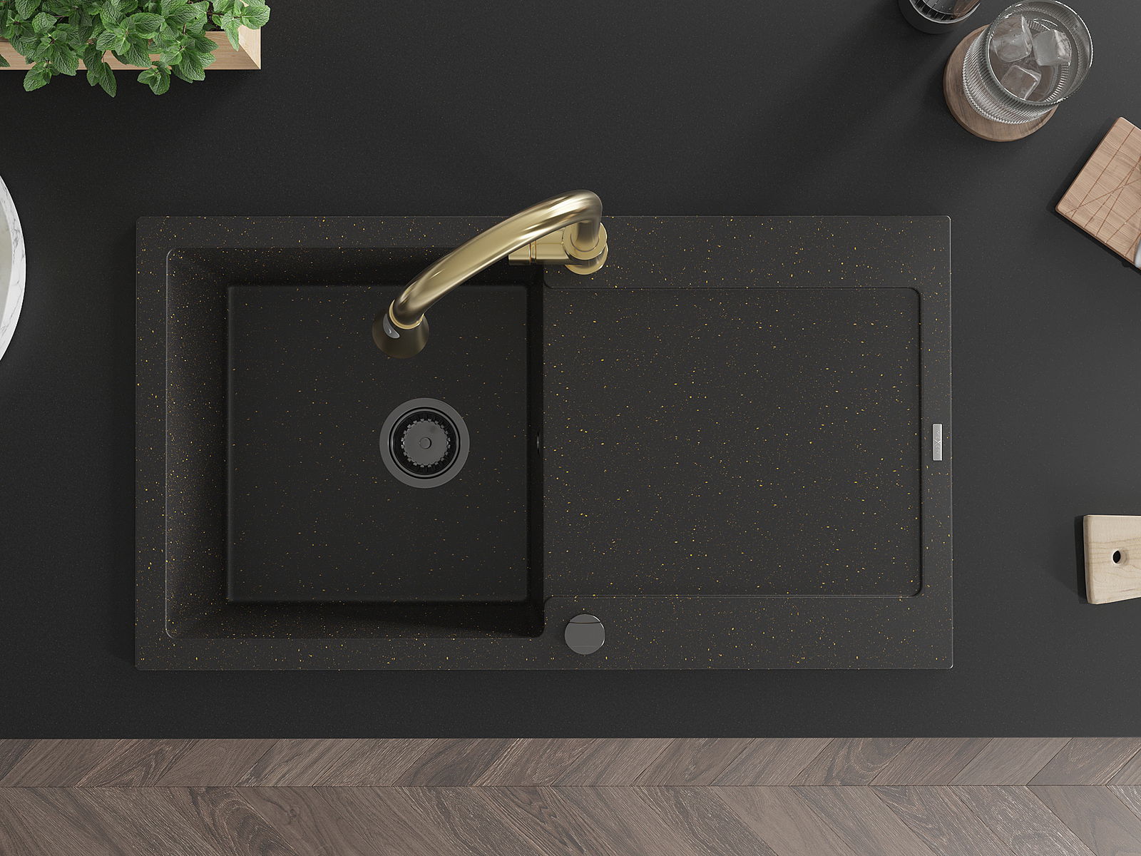 Mexen Leo кухненска мивка гранитна с 1 корито с отцедник и кухненски смесител Elia, черен/златист металик - 6501-75-670101-50-B