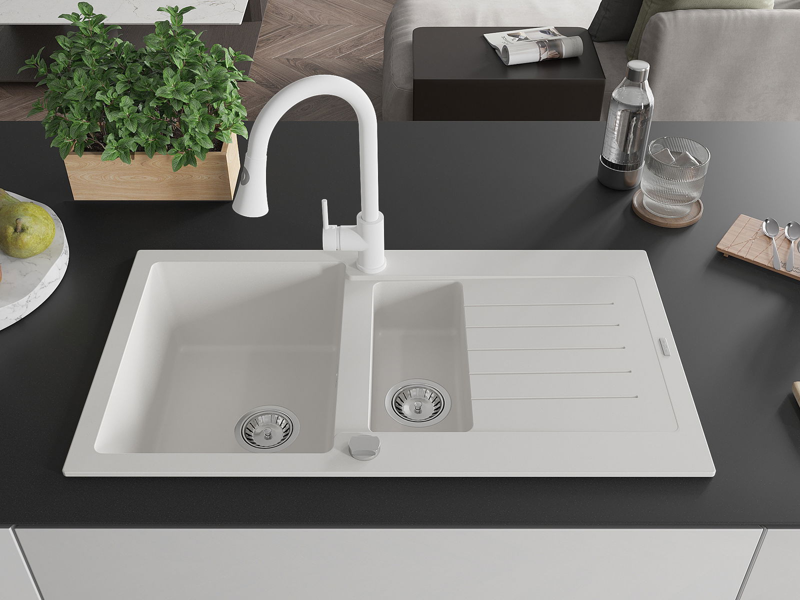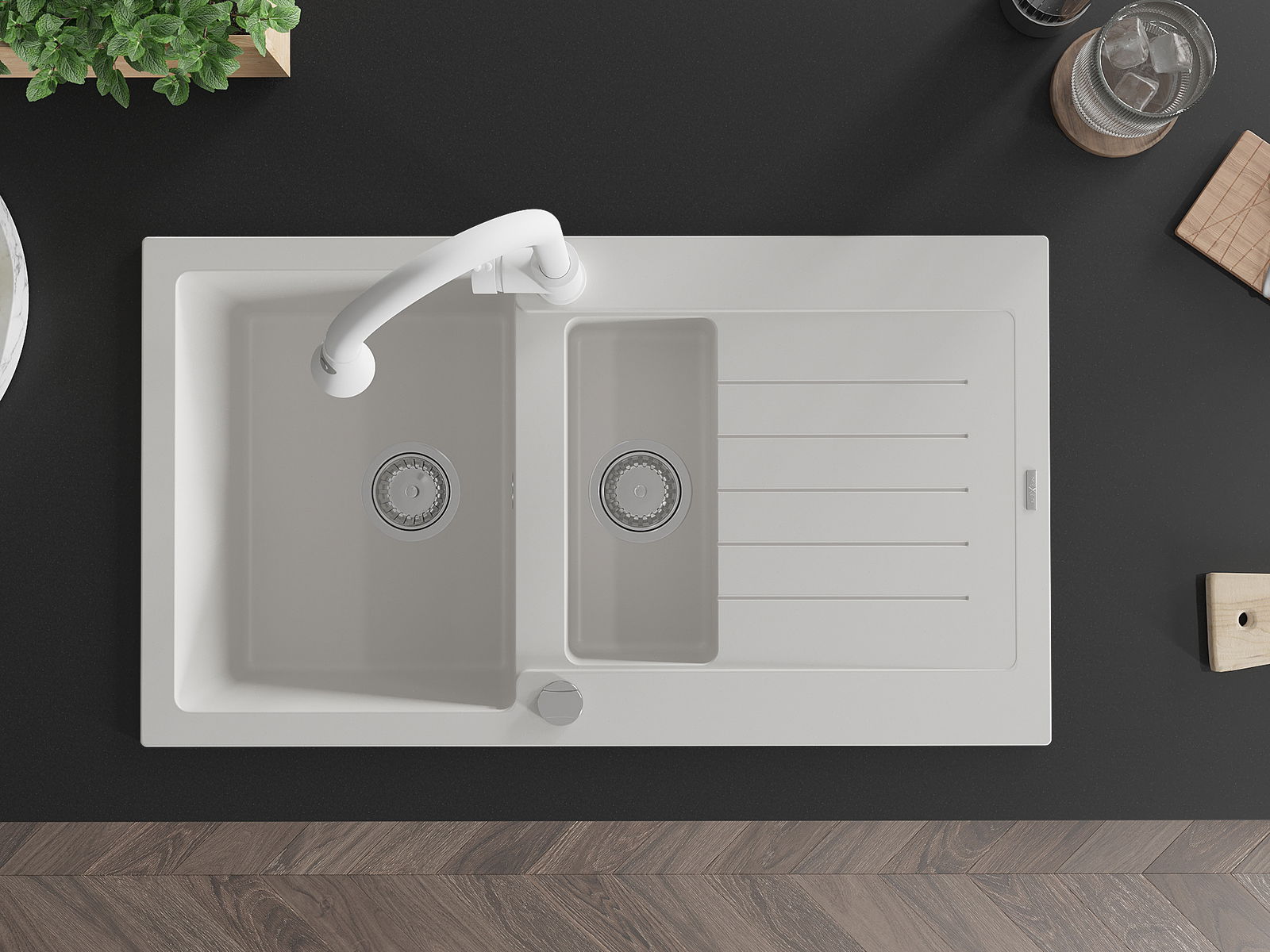 Mexen Matias гранитна мивка с 1,5 камери и отцедник и кухненски смесител Elia, бял - 6502-20-670101-20