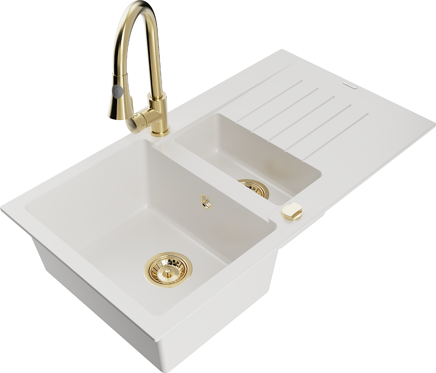 Mexen Matias гранитна мивка 1,5-коморна с отцедник и кухненски смесител Elia, бял - 6502-20-670101-50