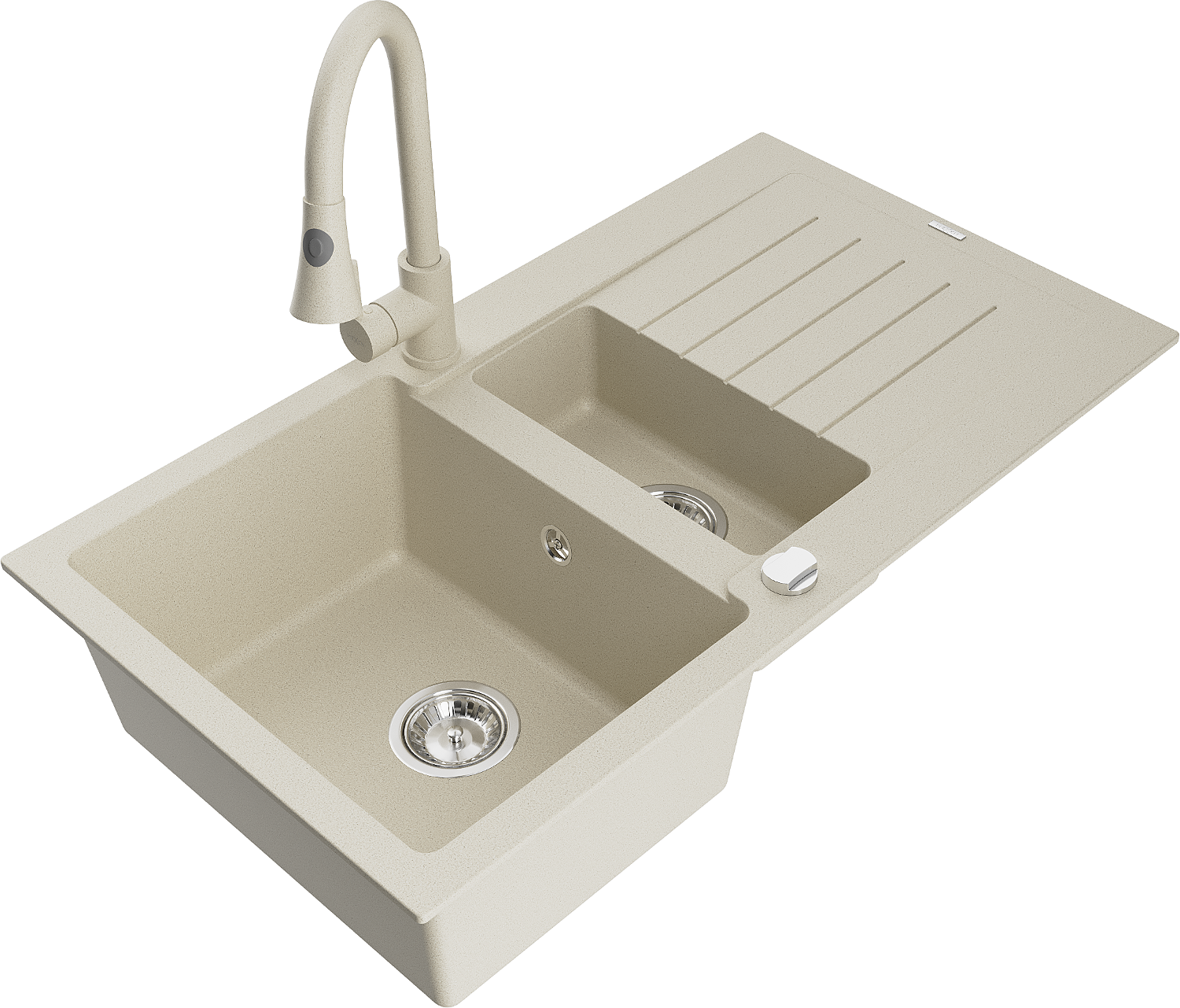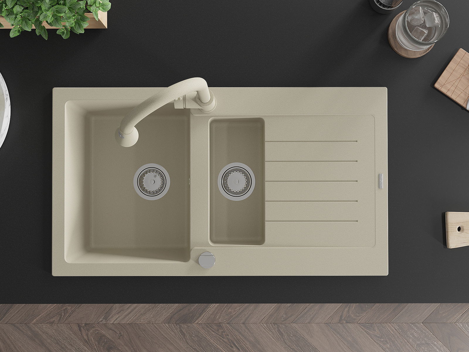 Mexen Matias гранитна мивка с 1,5 отделения с отцедник и кухненски кран Elia, бежов - 6502-69-670101-69