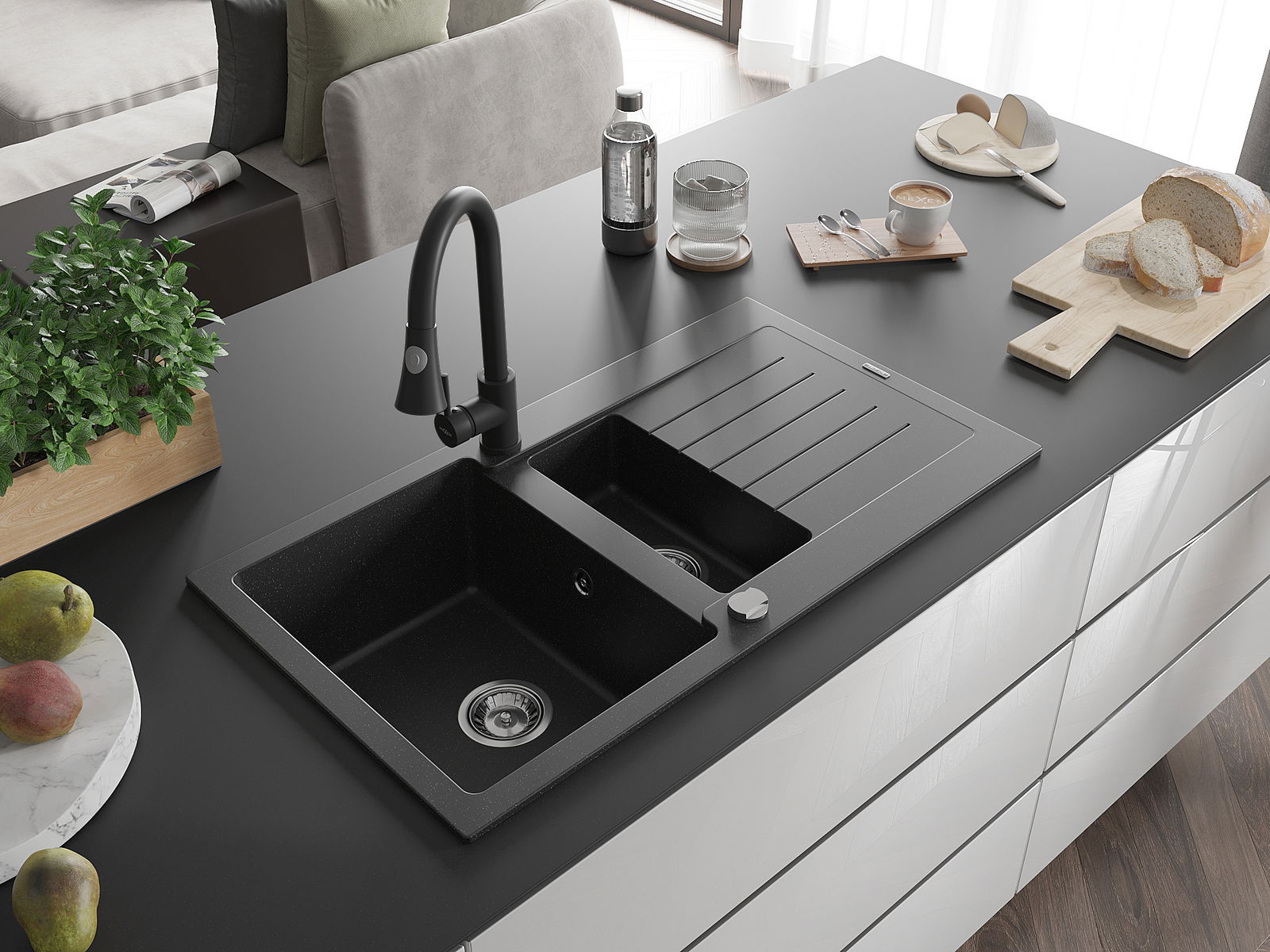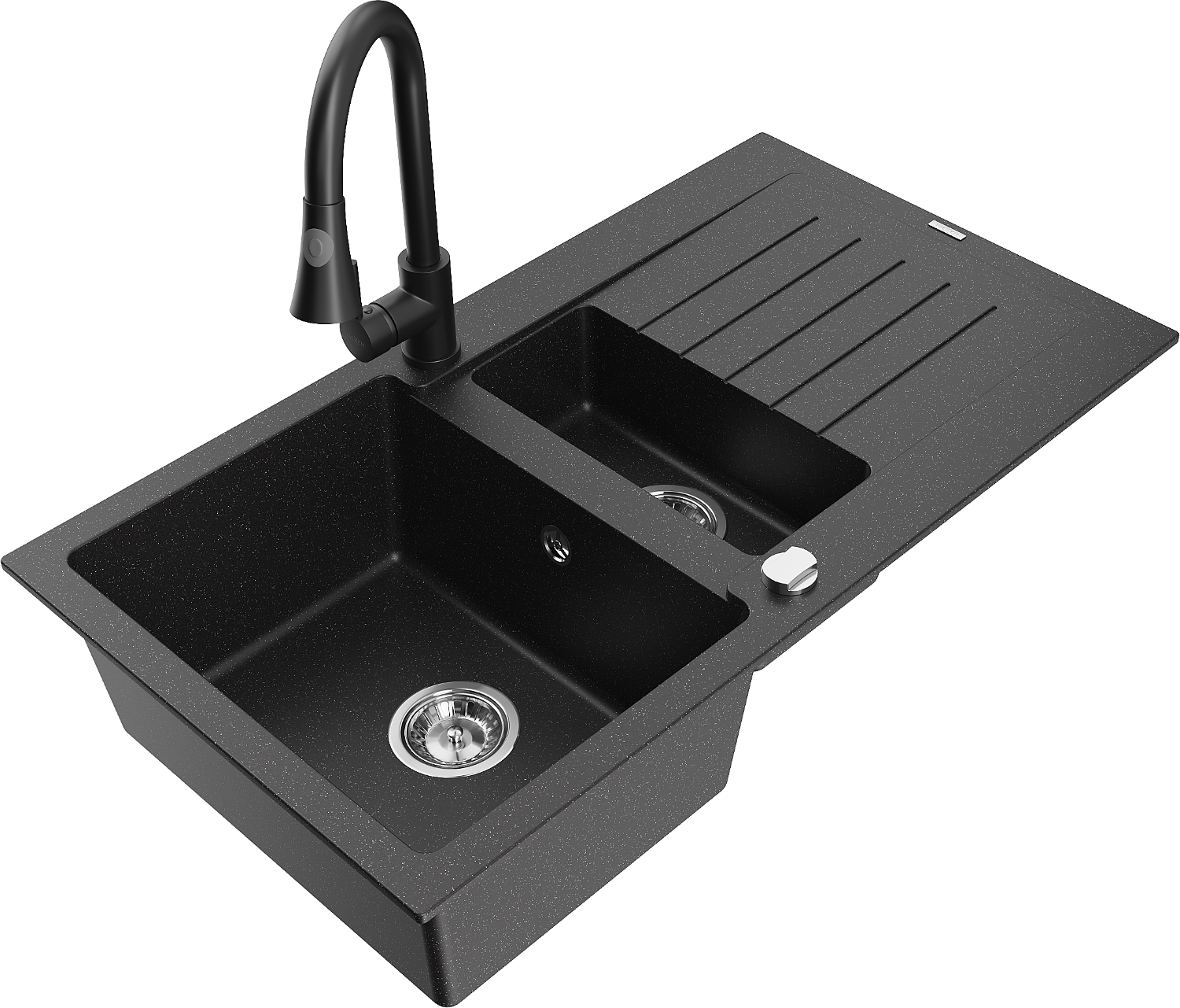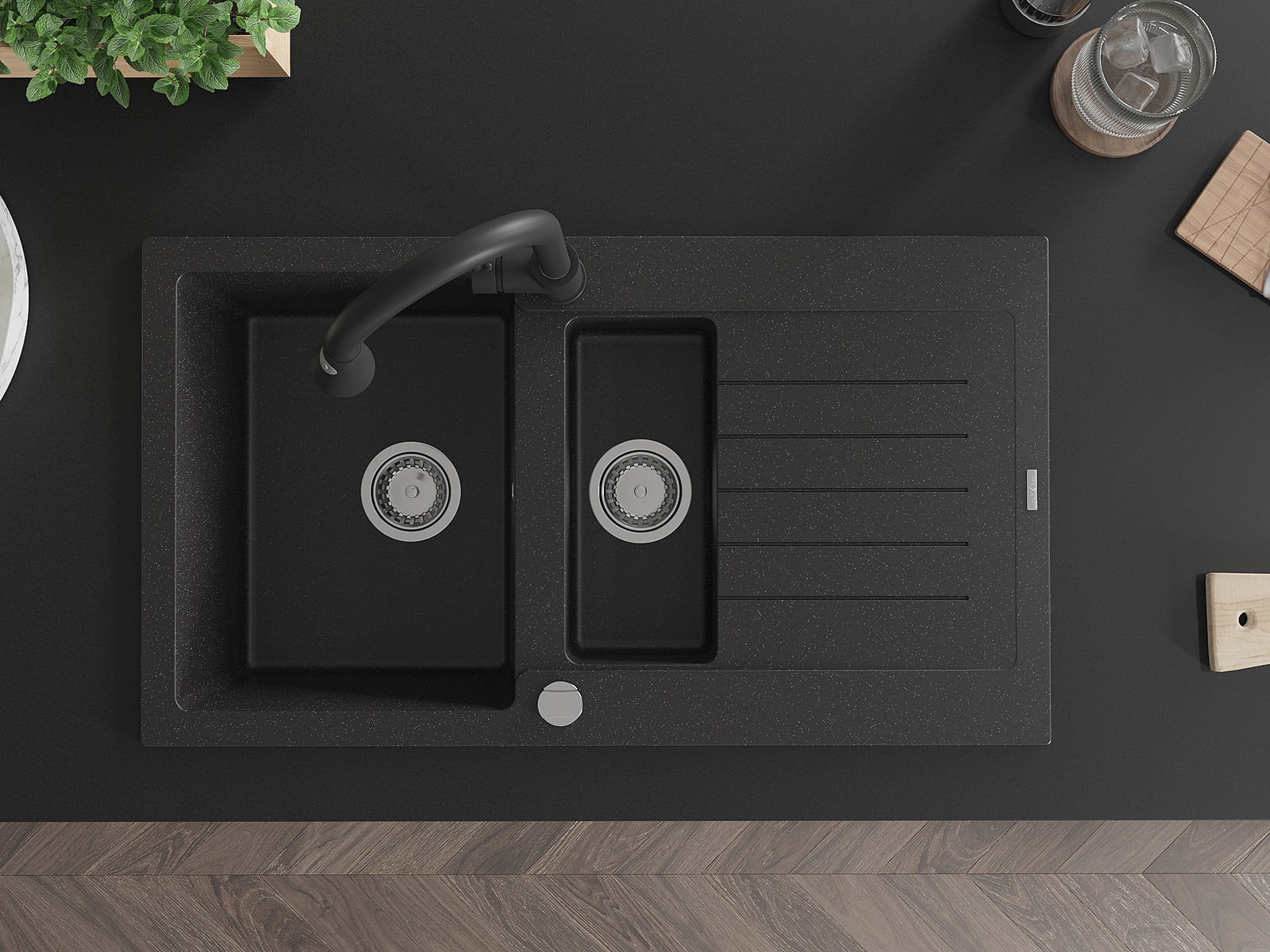 Mexen Matias гранитна мивка 1,5-корпусна със сушилня и кухненски смесител Elia, черно/сребърен металик - 6502-73-670101-70