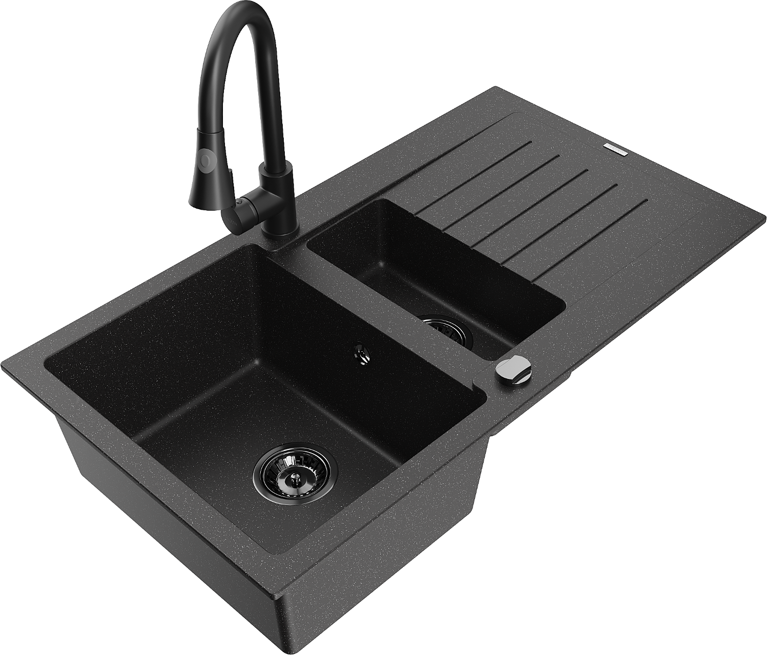 Mexen Matias гранитна мивка 1,5-коморна с дренаж и кухненски смесител Elia, черно/сребърно - 6502-73-670101-70-B