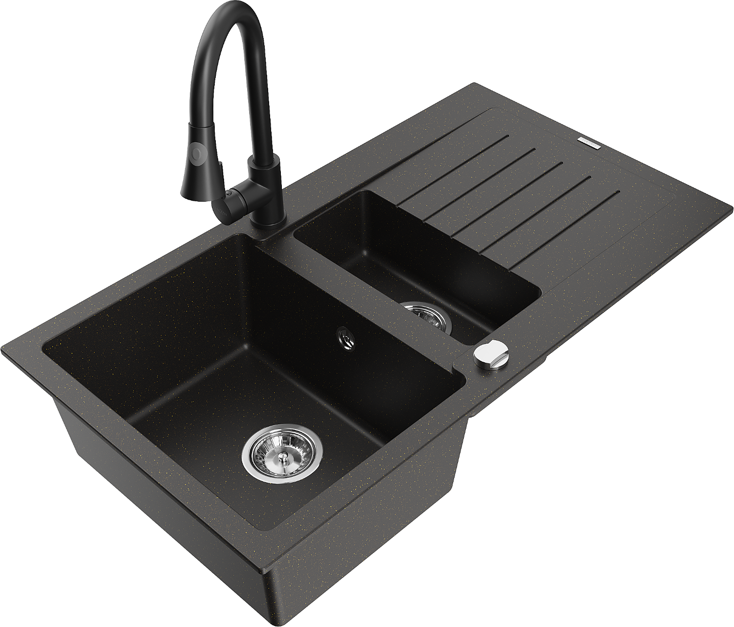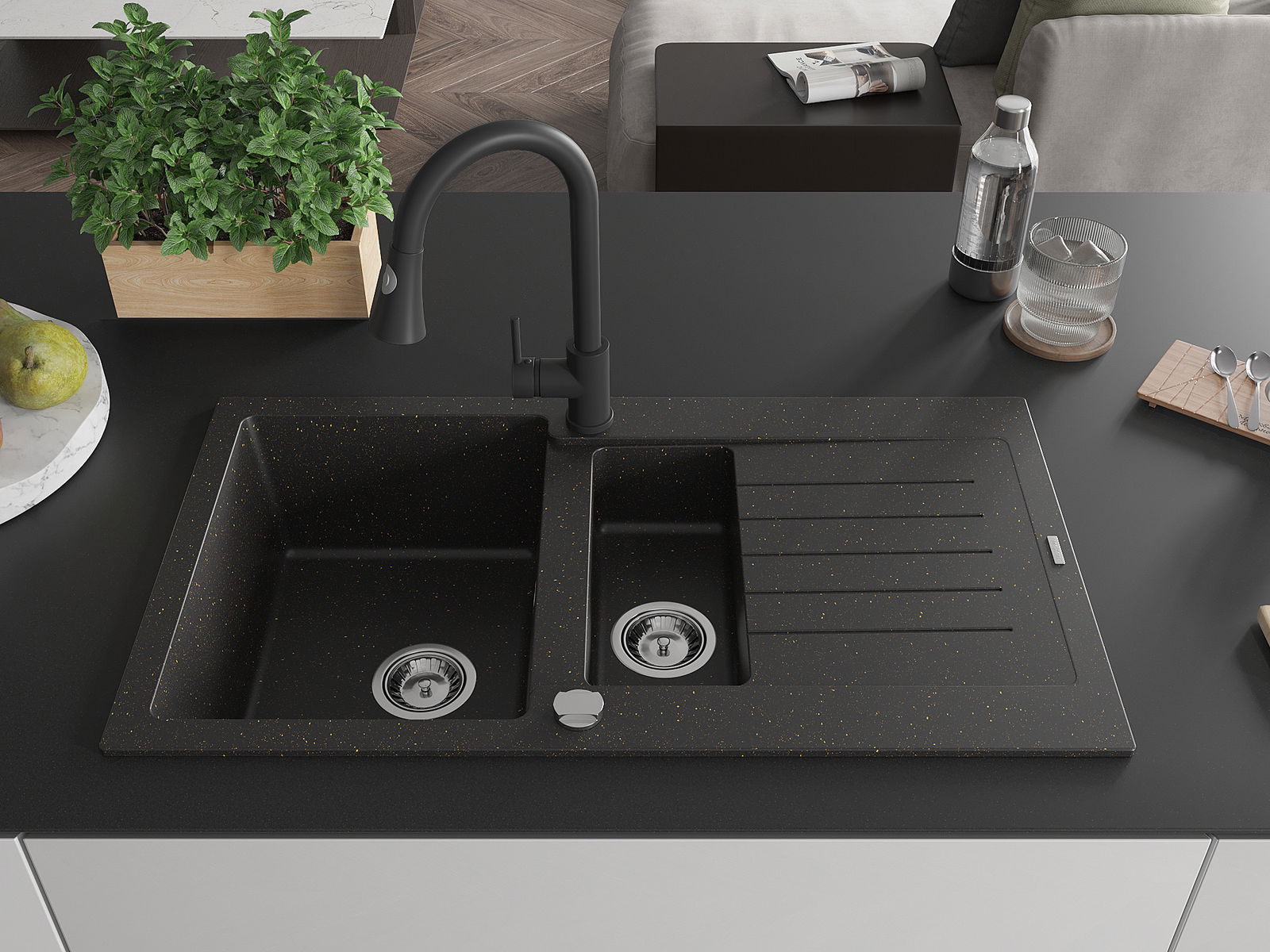 Mexen Matias гранитна мивка 1,5-камерна с отцедник и кухненски смесител Elia, черен/златен металик - 6502-75-670101-70