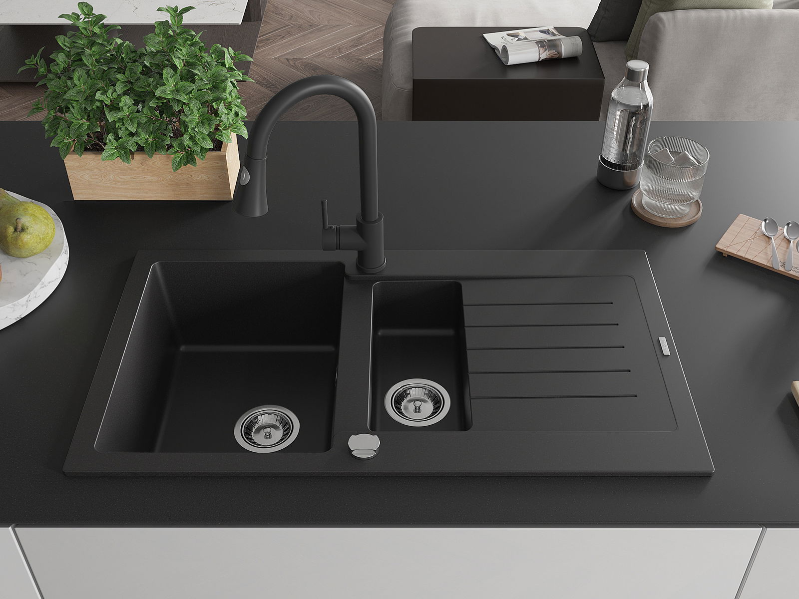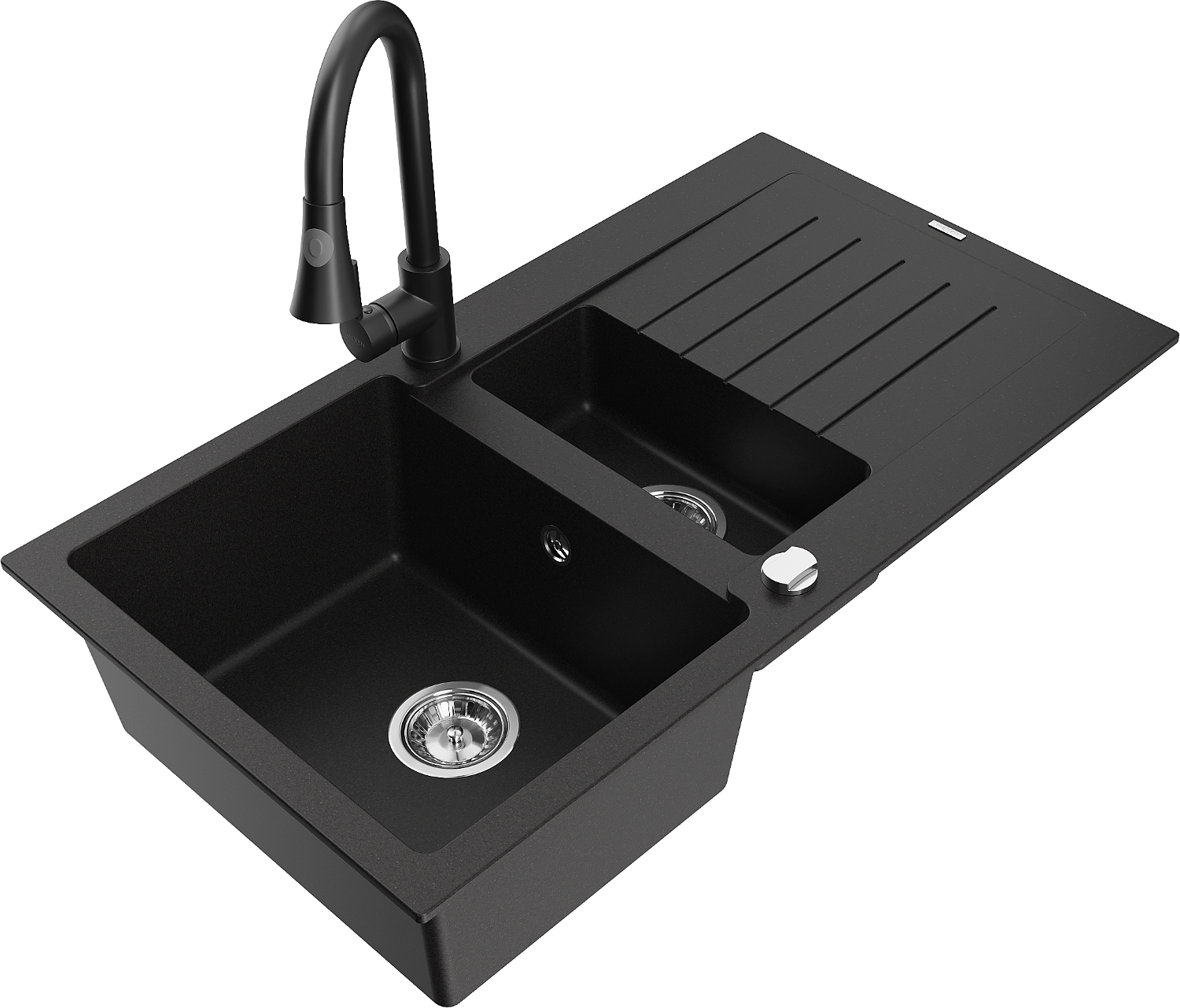 Mexen Matias гранитна мивка 1,5-коморна с отцедливка и кухненски смесител Elia, черна - 6502-77-670101-70
