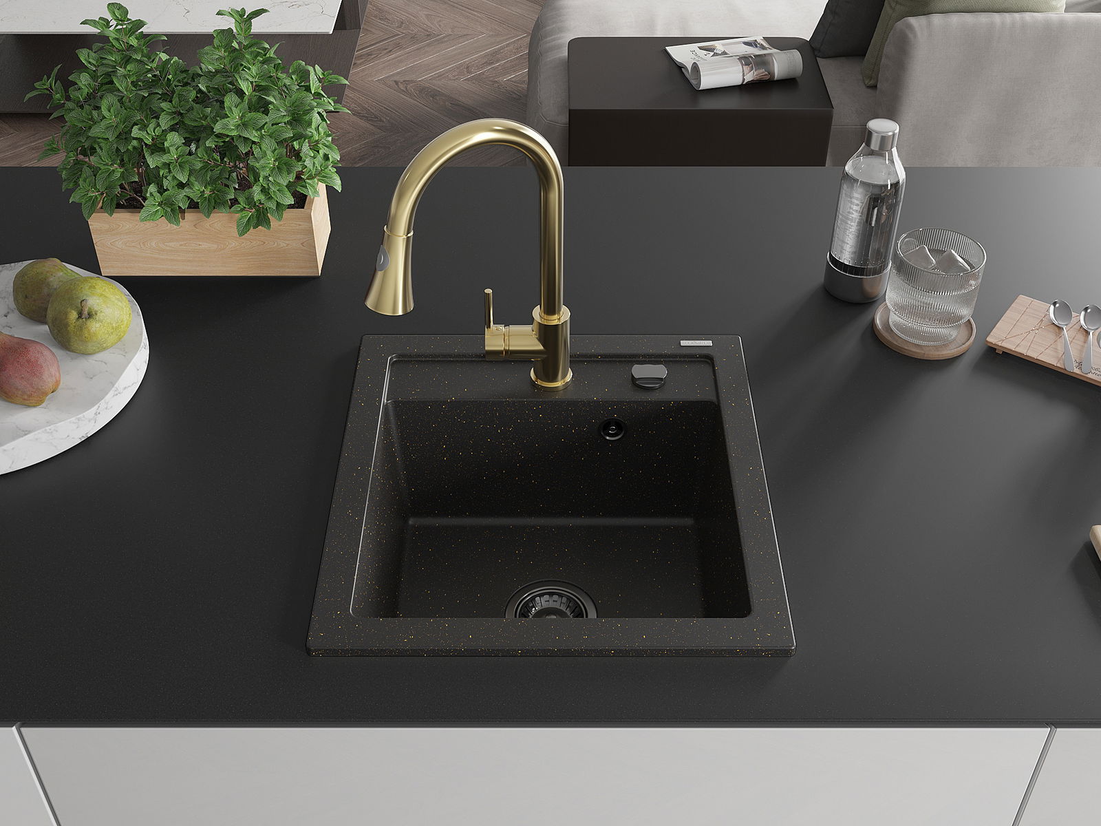 Mexen Vito гранитна мивка с 1 отделение с кухненски смесител Elia, черен/златист металик - 6503-75-670101-50-B