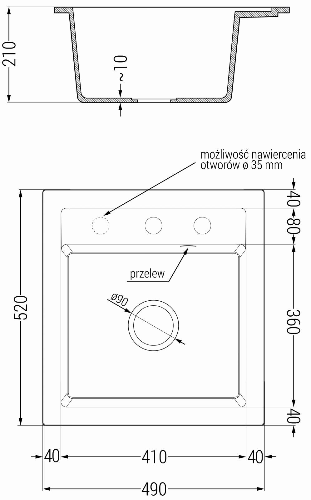 Мивката разполага с предварително издълбан отвор с диаметър 35 мм за самостоятелно изключване. Може да се използва, наред с други неща, за монтаж на дозатор за течност, който ще елиминира наличието на пластмасови бутилки в кухнята и ще й придаде елегантно завършване.