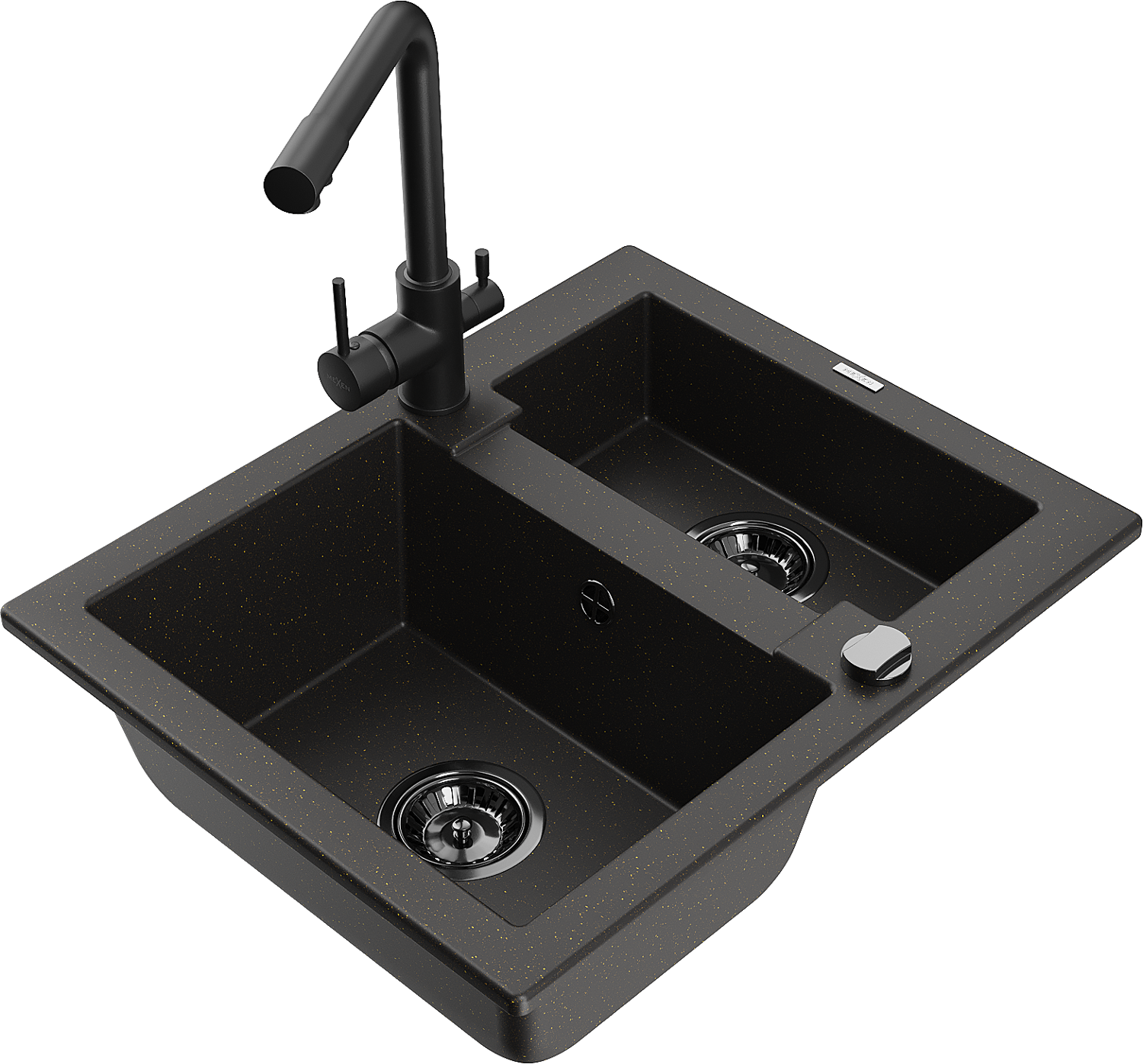 Mexen Carlos гранитна мивка 1.5-коморова с кухненски смесител Duero, черен/златист металик - 6518-75-671600-70-B