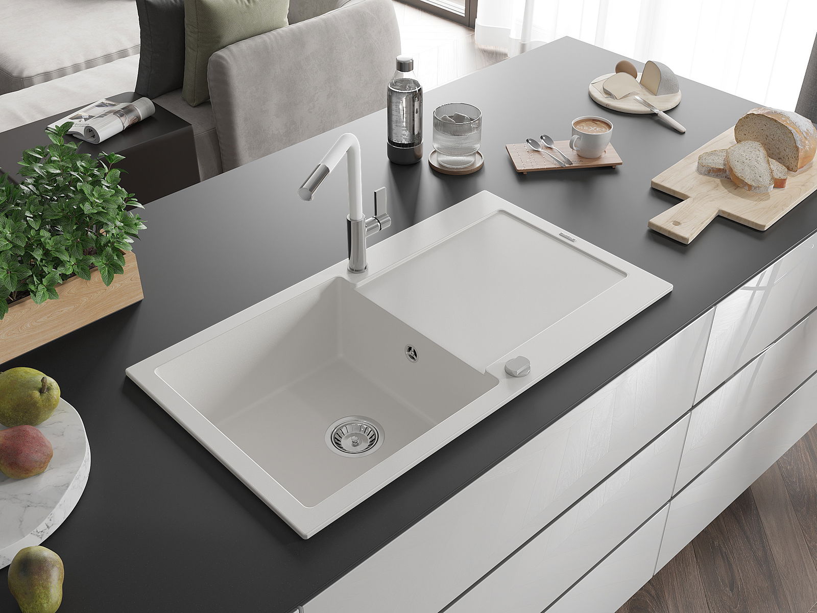 Mexen Leo гранитна кухненска мивка 1-коморна с отцедник и кухненски смесител Flora, бял - 6501-20-670401-02