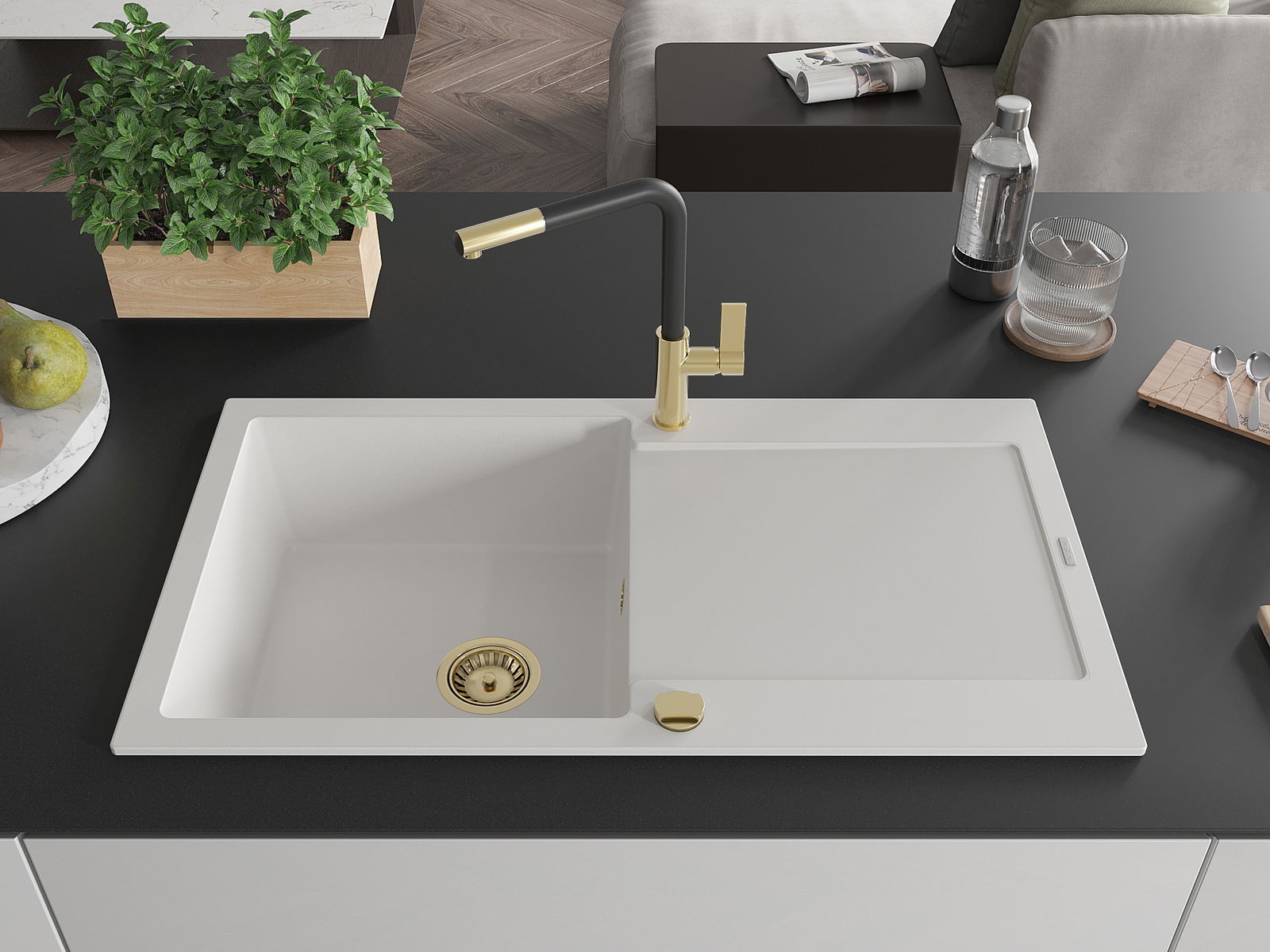 Мивката е направена от висококачествен гранит. Това е елегантно и най -вече практично допълнение към всяка кухня, независимо от нейния стил. Висококачествената и гранитна издръжливост осигуряват много години употреба.