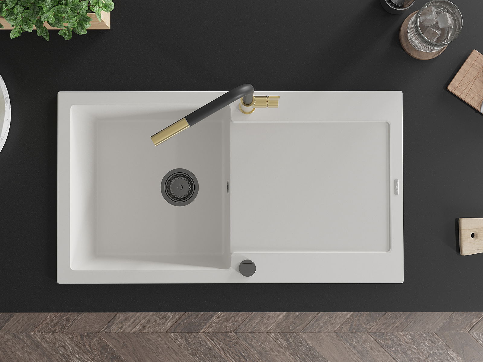 Mexen Leo гранитна мивка с 1 гнездо с отцедник и кухненски смесител Flora, бял - 6501-20-670401-57-B