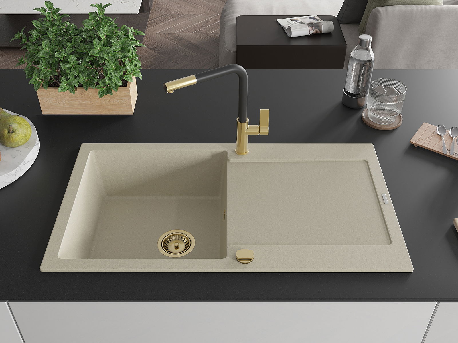 Mexen Leo гранитна мивка с 1 камера с отцедник и кухненски смесител Flora, бежов - 6501-69-670401-57-G