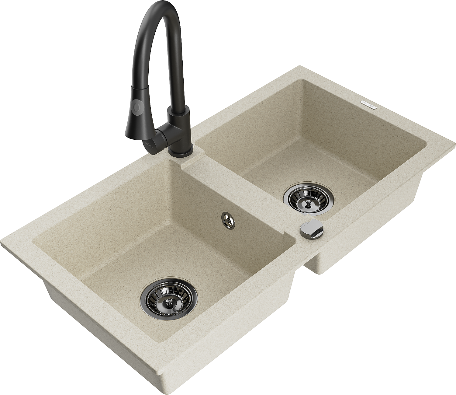 Mexen Mario гранитна мивка с 2 отделения с кухненски смесител Elia, бежов - 6504-69-670101-70