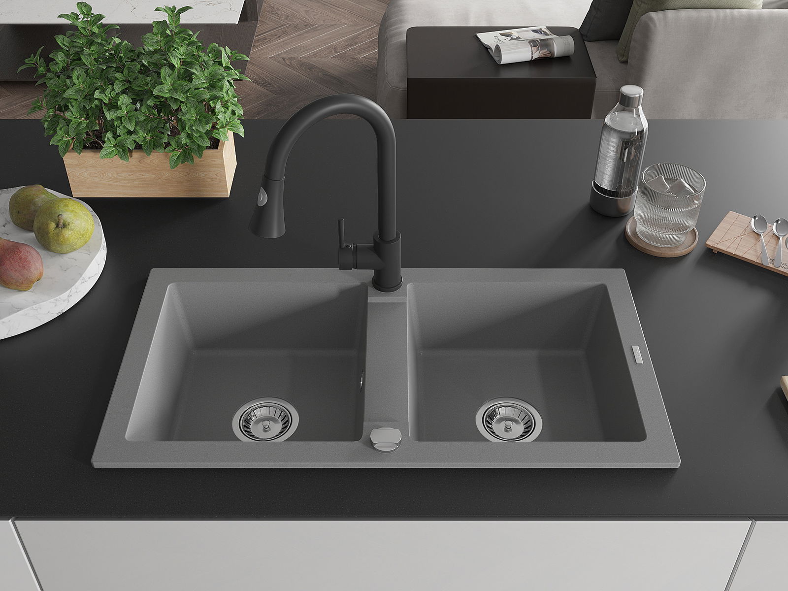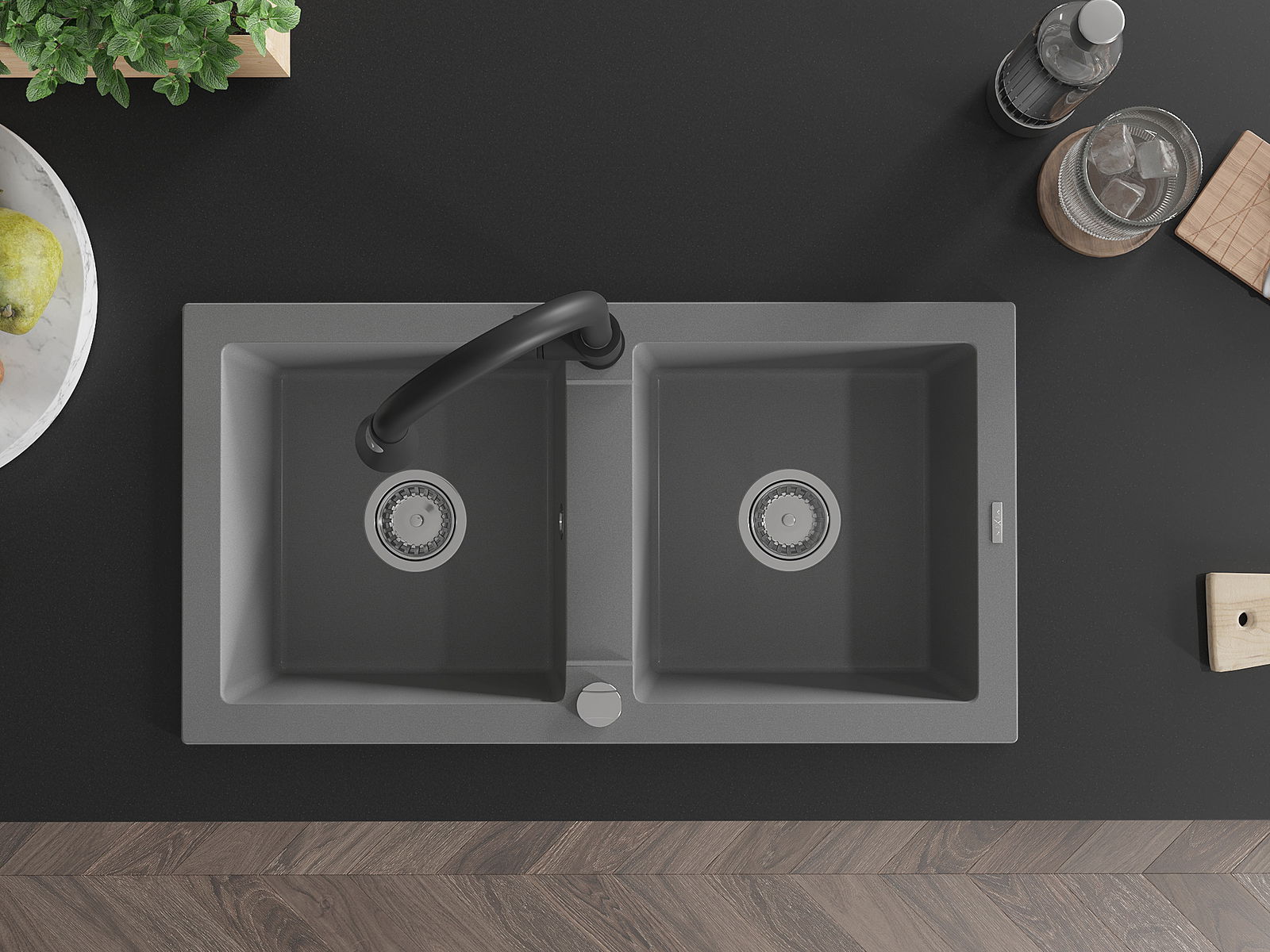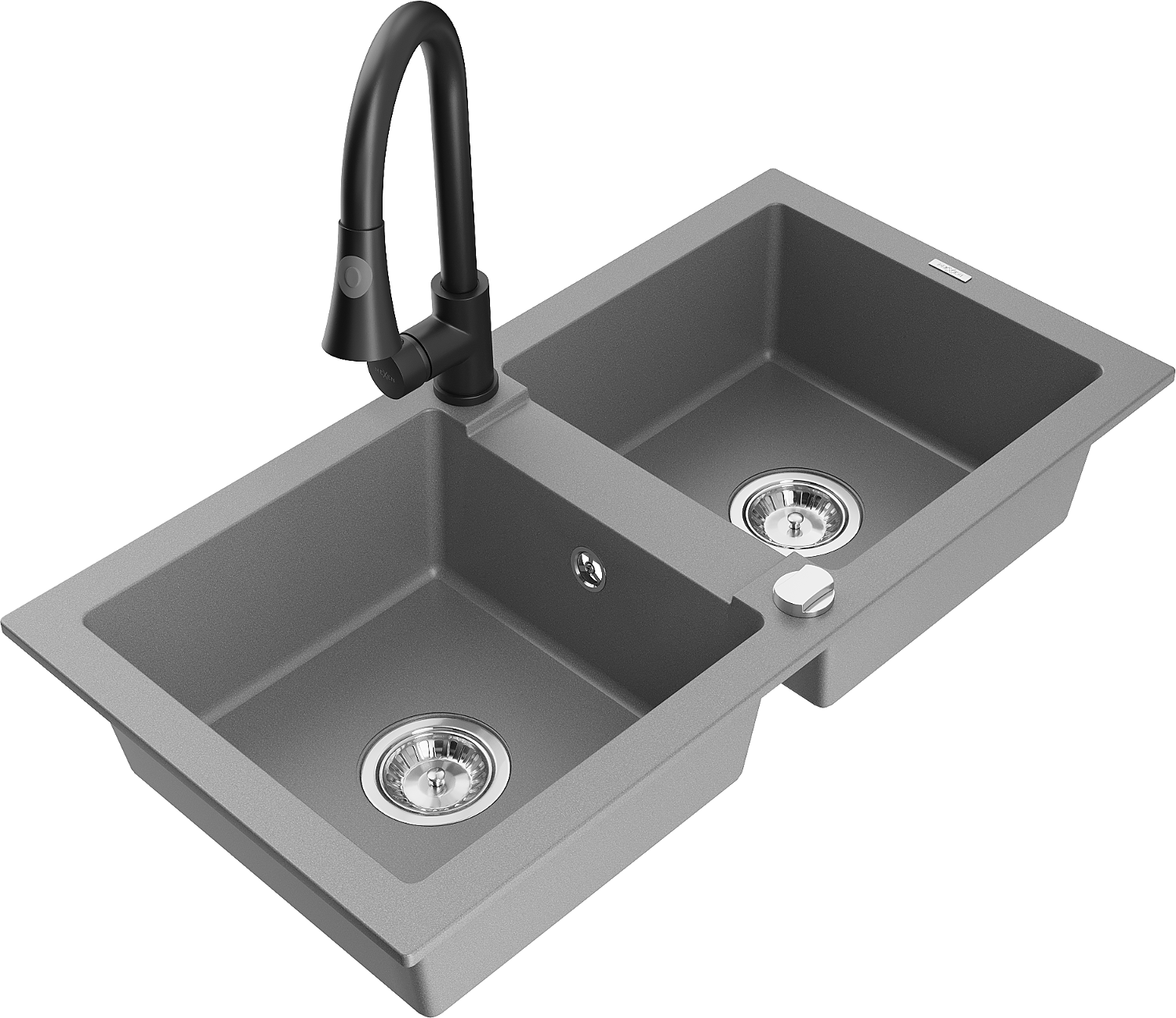 Mexen Mario гранитна мивка с 2 камери с кухненски смесител Elia, сив - 6504-71-670101-70