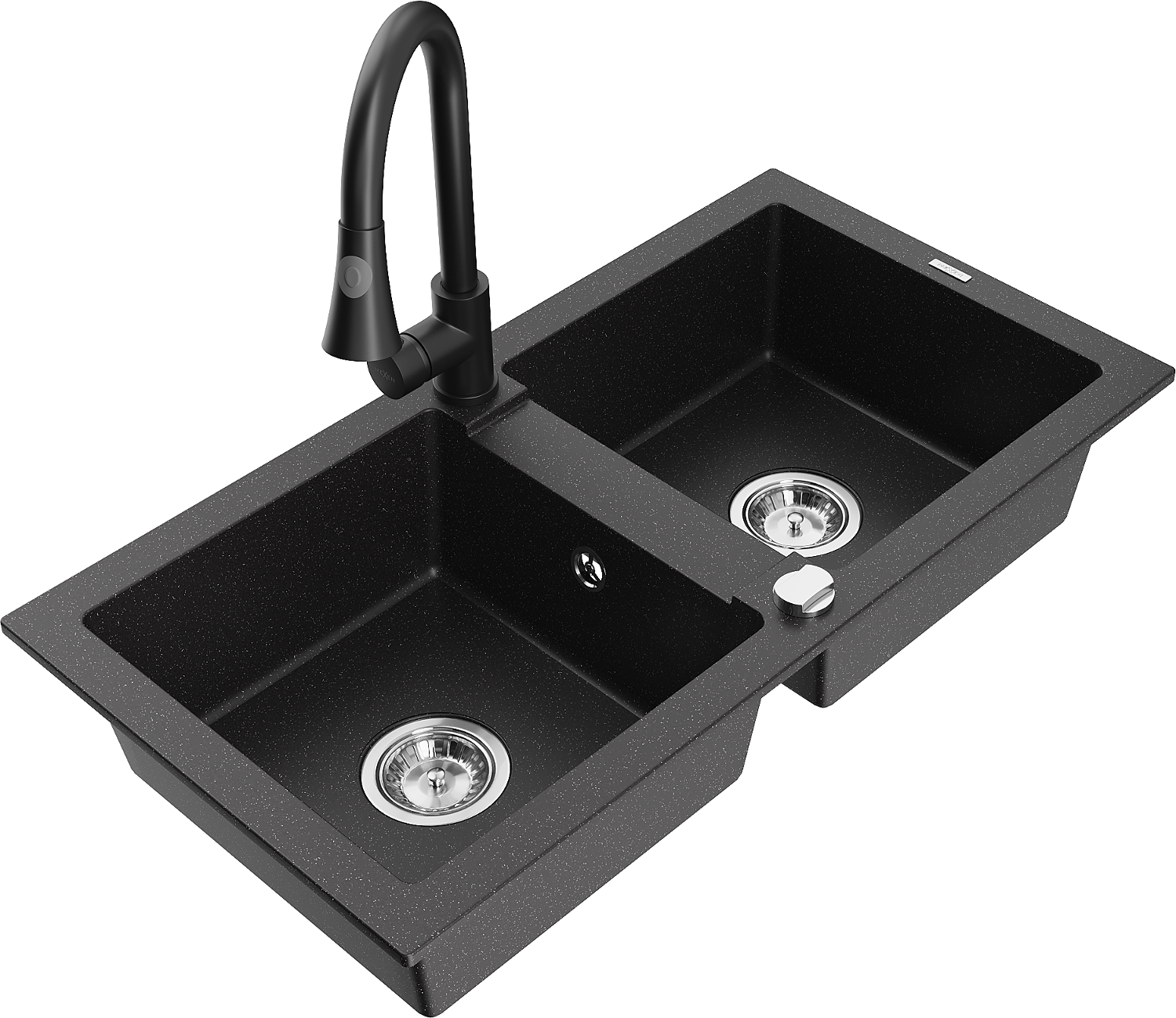 Mexen Mario гранитна мивка с 2 корита и кухненски смесител Elia, черен/сребрист металик - 6504-73-670101-70