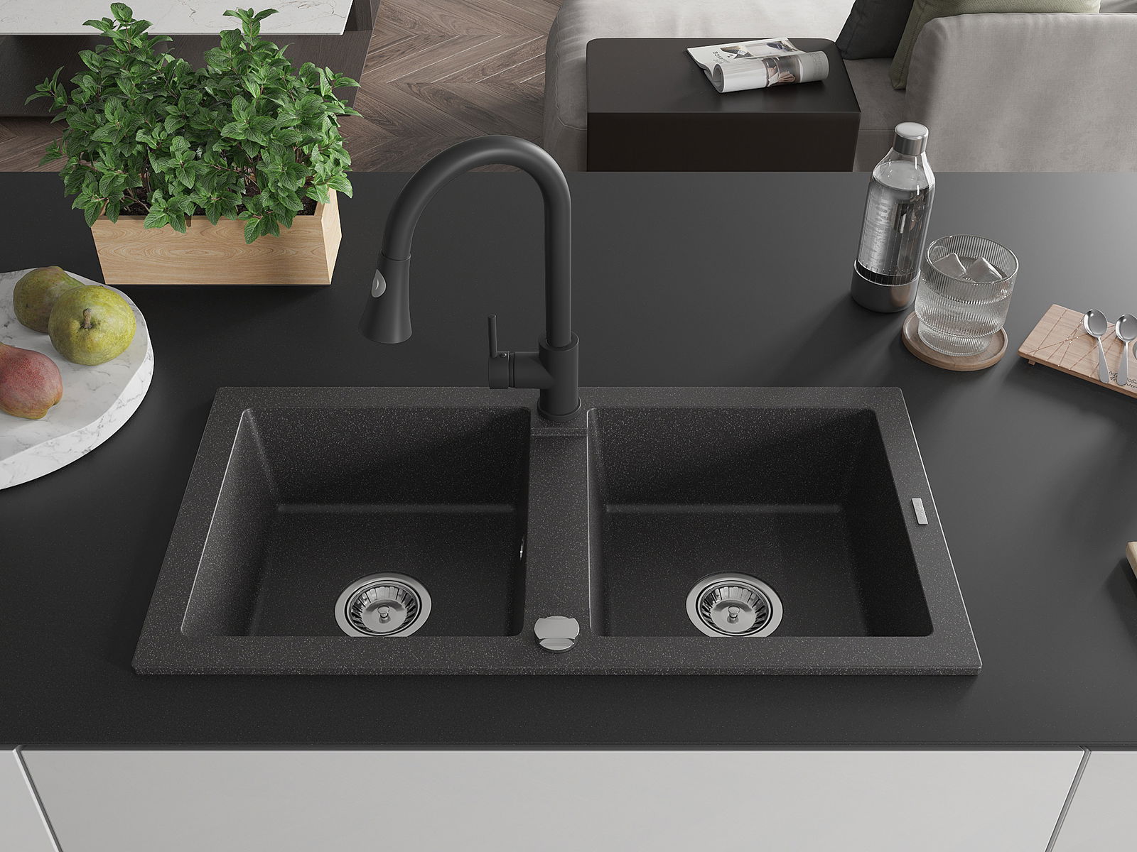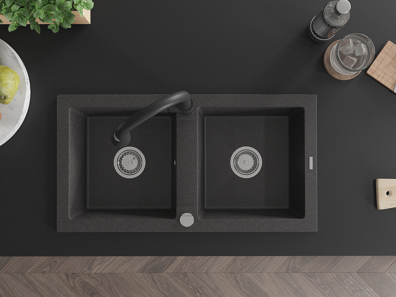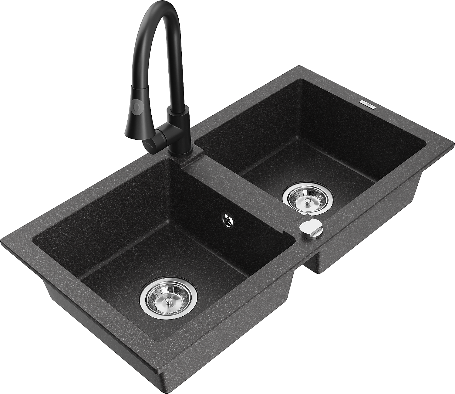 Mexen Mario гранитна мивка с 2 отделения с кухненски смесител Elia, черно на пръски - 6504-76-670101-70
