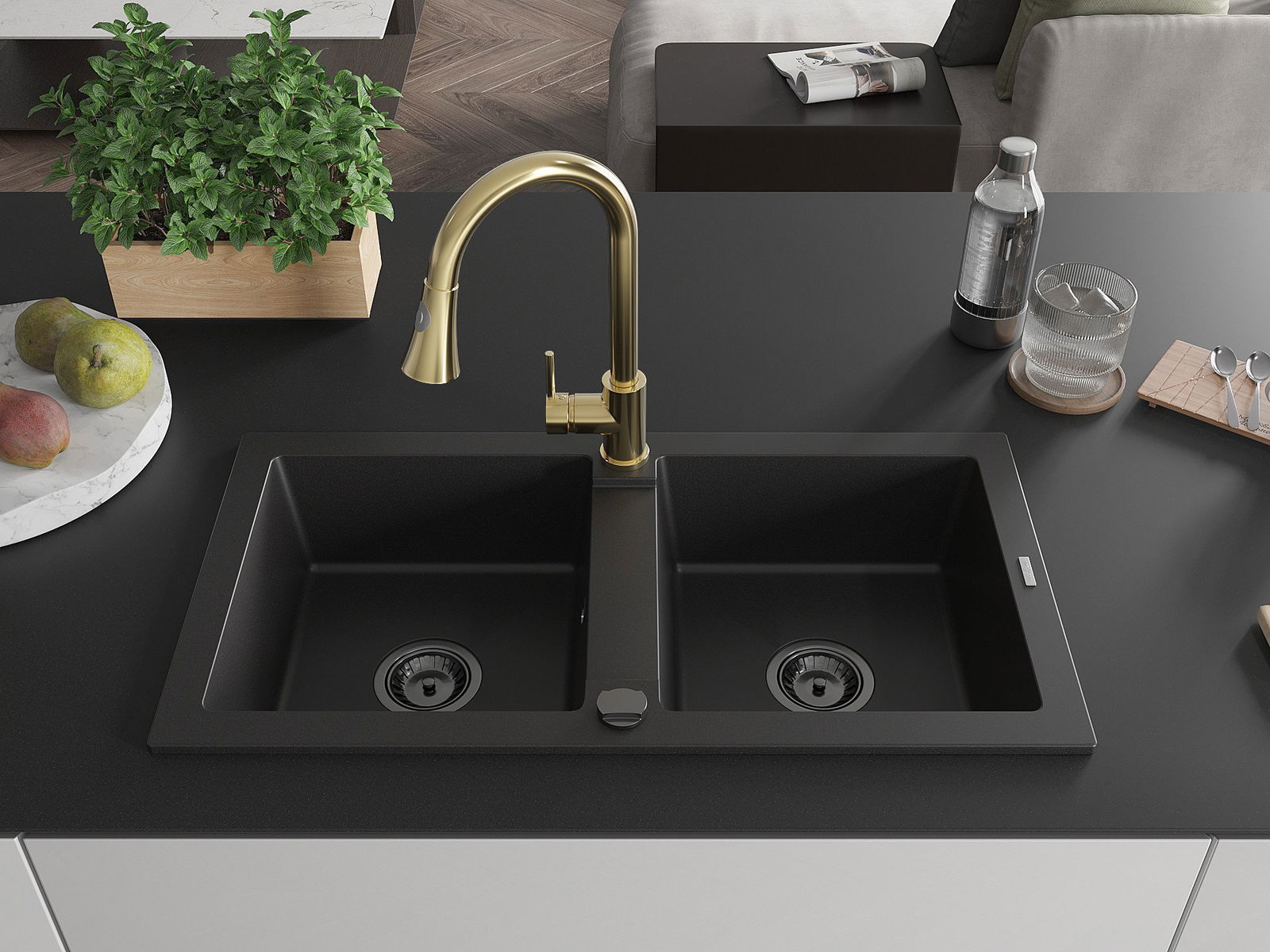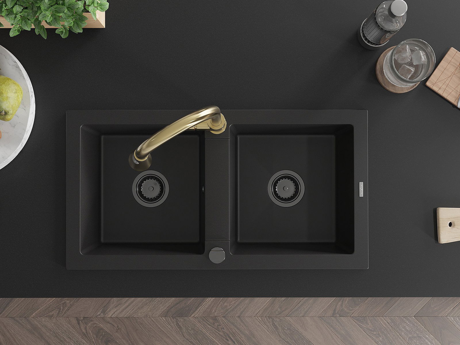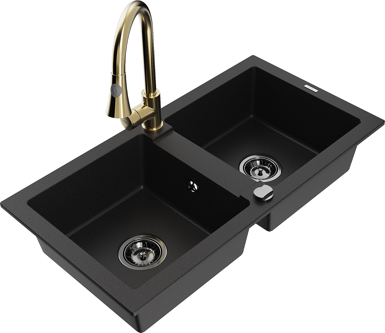 Mexen Mario гранитна мивка с 2 корита и кухненски смесител Elia, черен