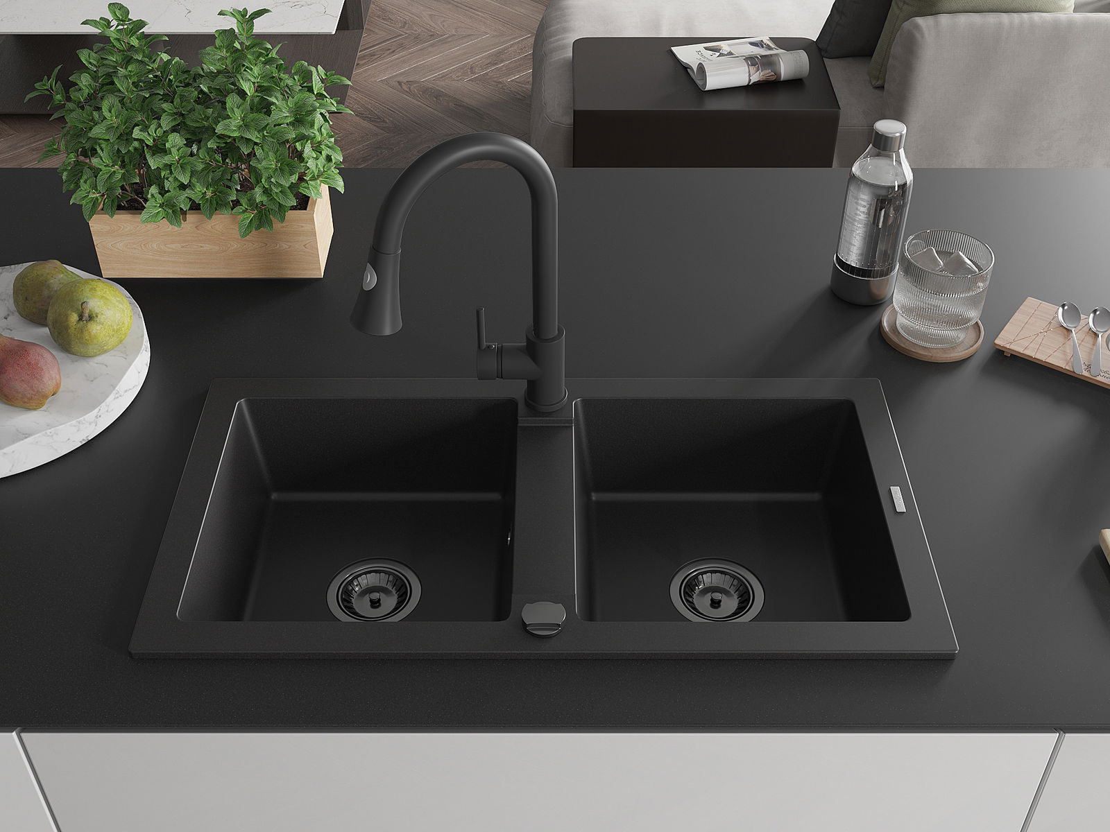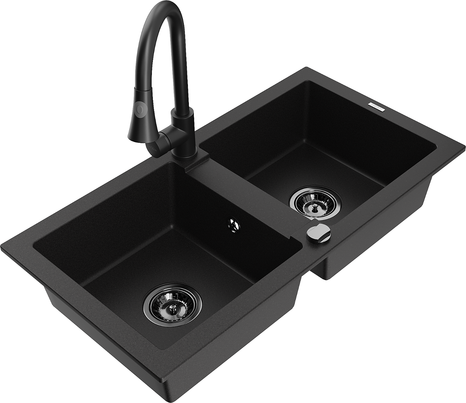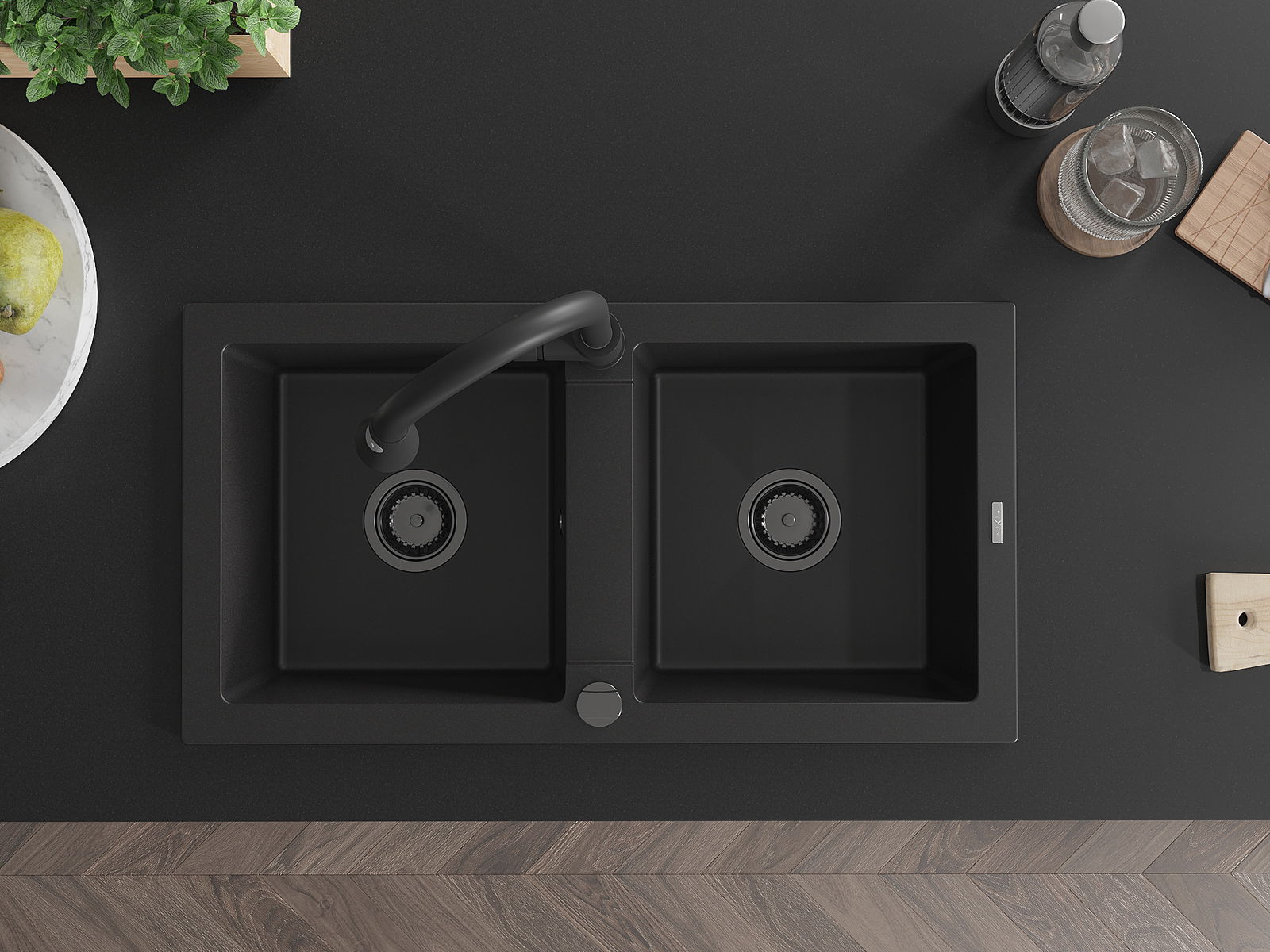 Mexen Mario двоен гранитен мивка с кухненски смесител Elia, черен - 6504-77-670101-70-B