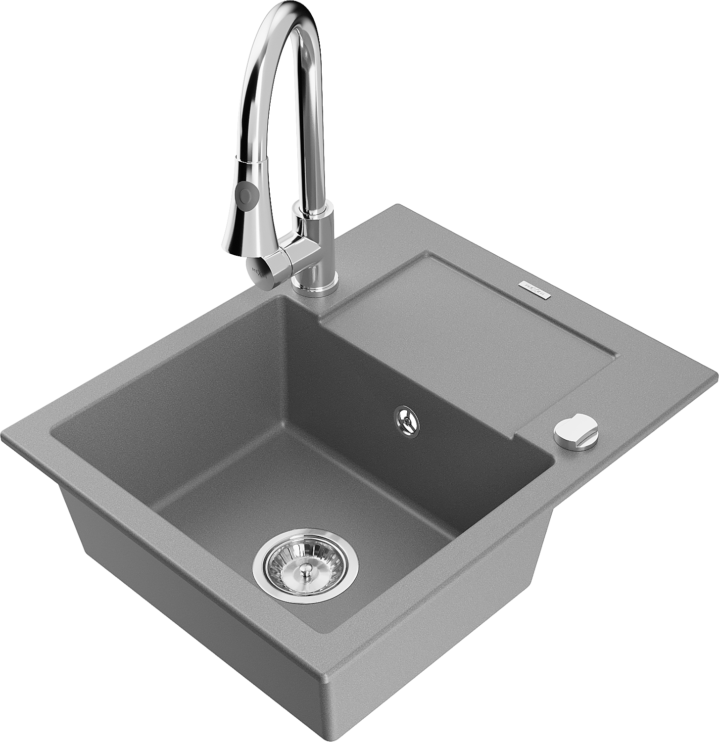 Mexen Enzo гранитна мивка с 1 гнездо и отцеждвател и кухненски кран Elia, сив - 6506-71-670101-00