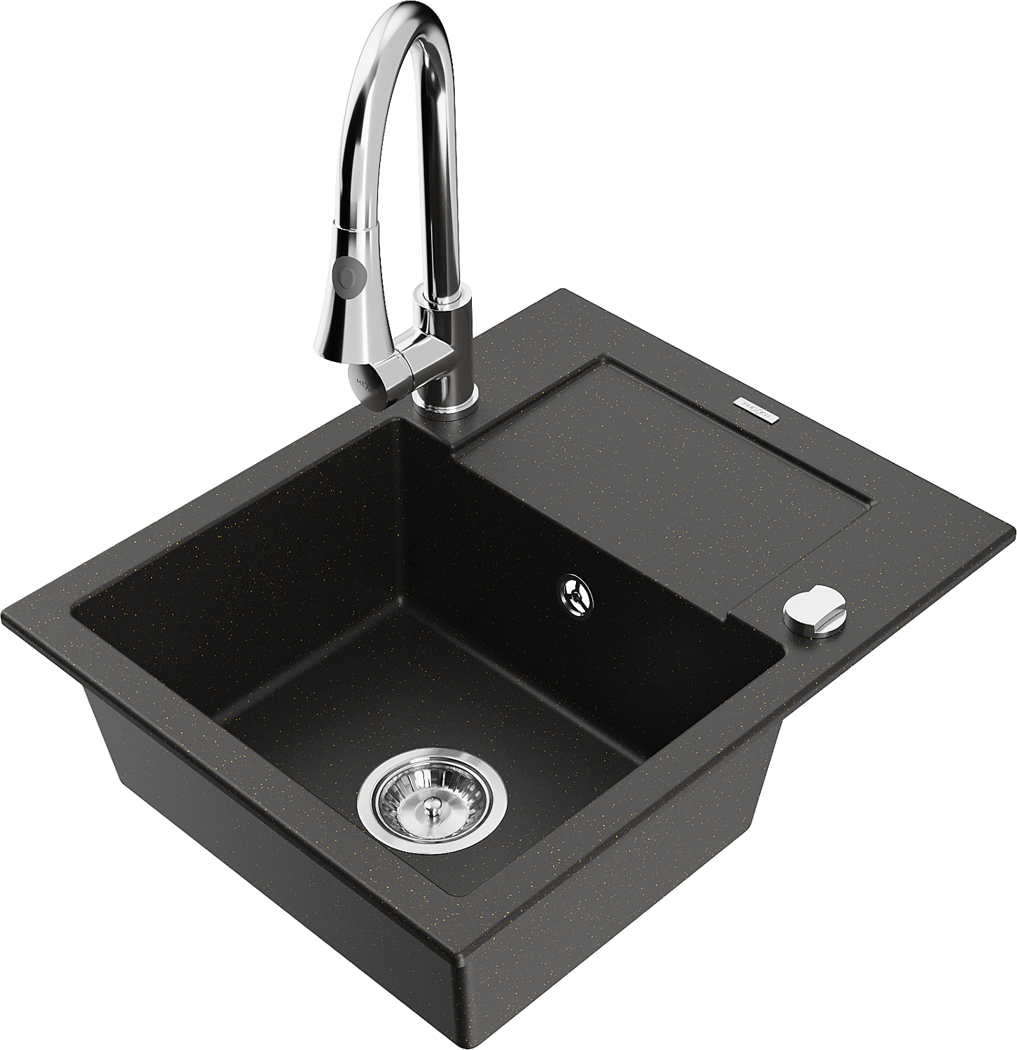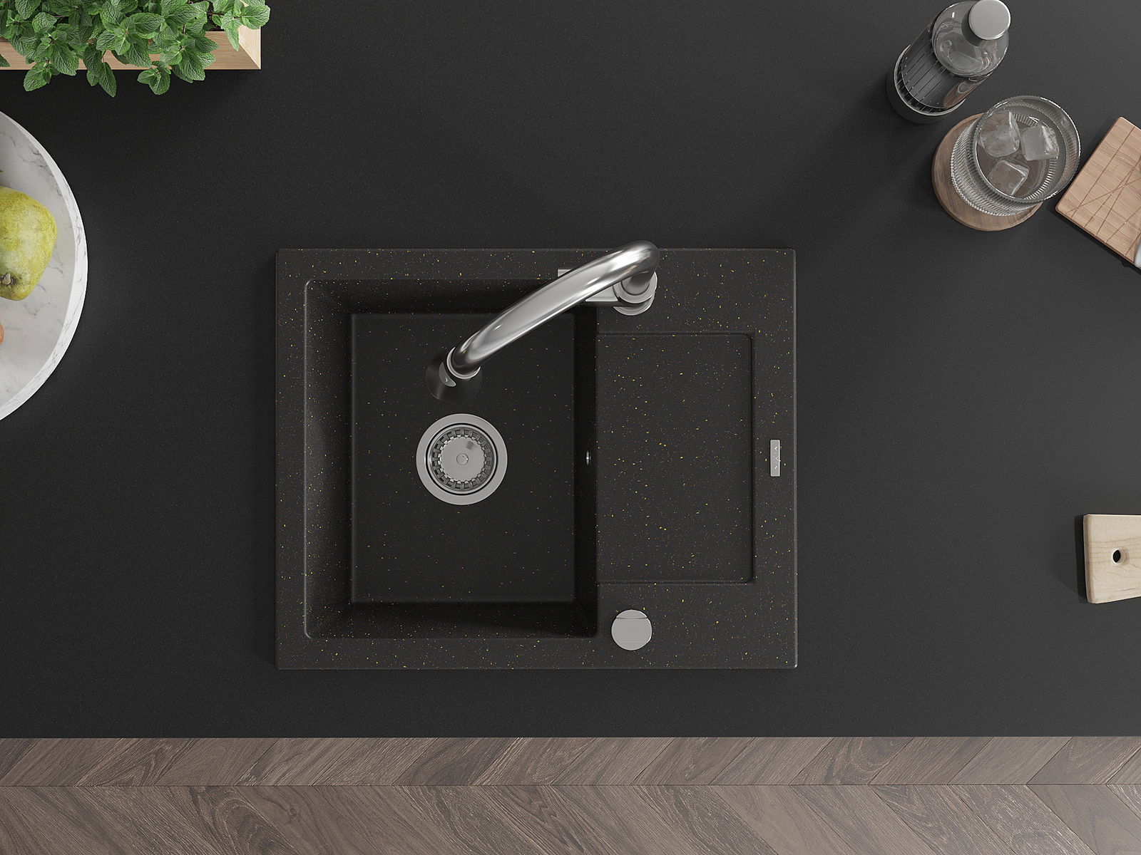 Mexen Enzo гранитна мивка с 1 камера с отцедник и кухненски смесител Elia, черно/златен металик - 6506-75-670101-00