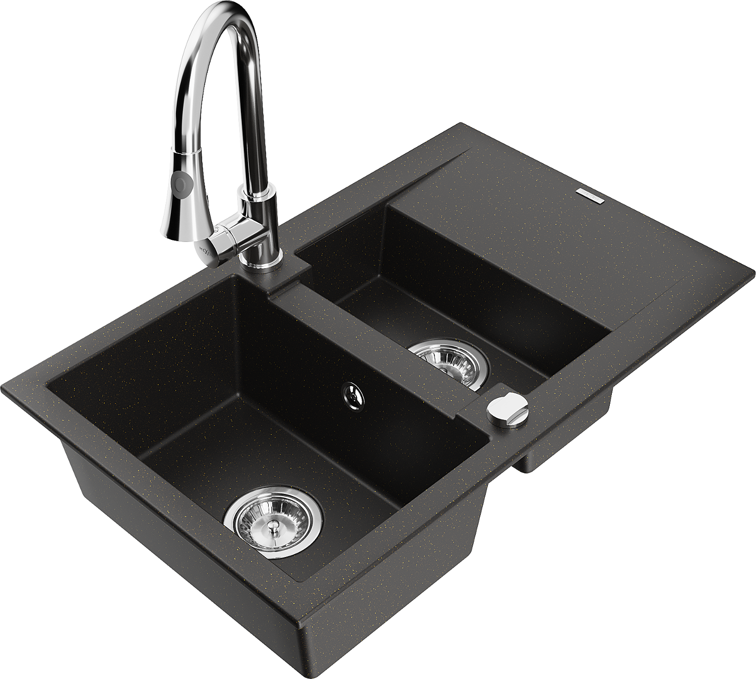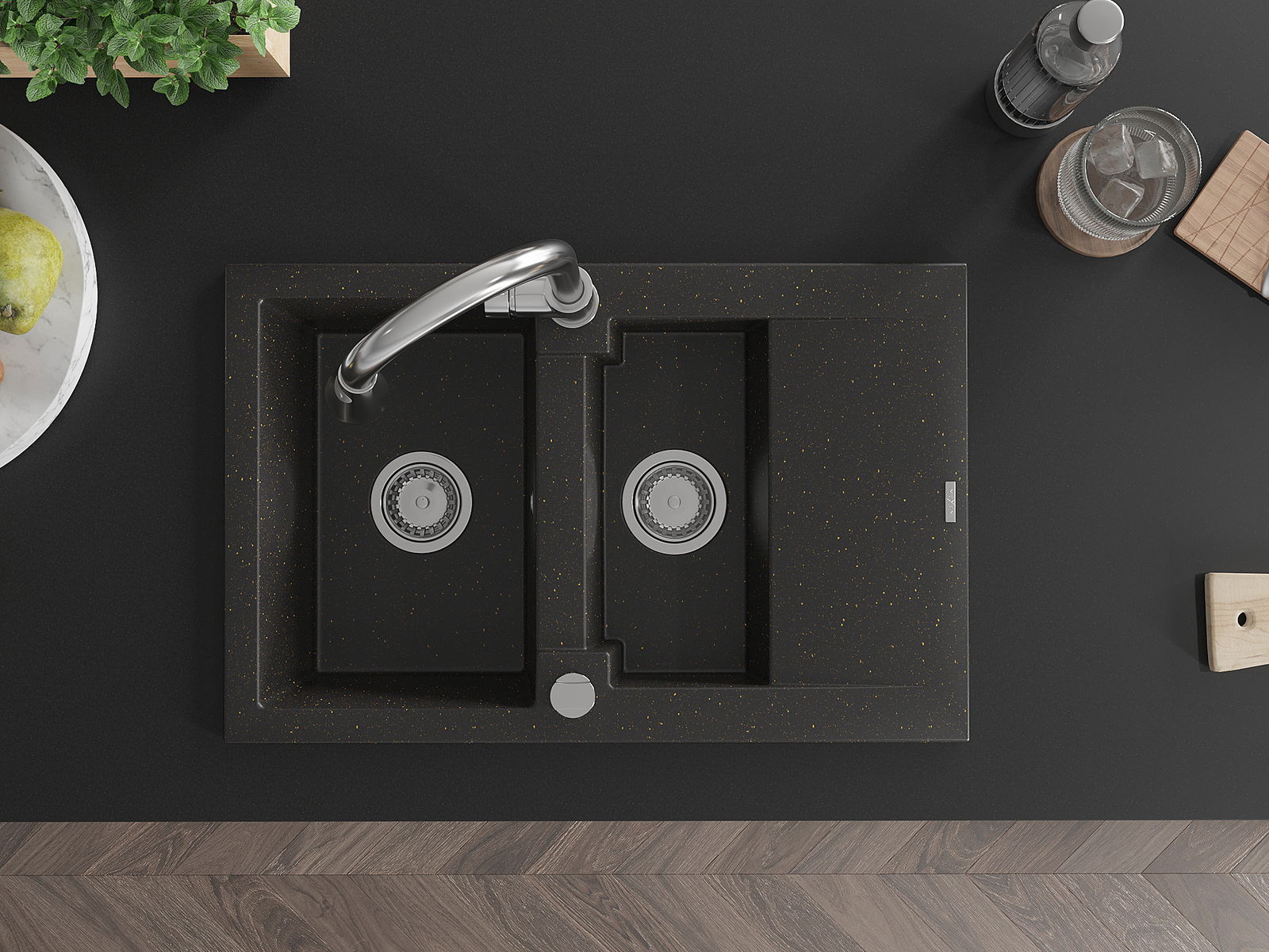 Mexen Gaspar гранитна мивка 1,5-камерна с плоча и кухненски смесител Elia, черно/златен металик - 6507-75-670101-00