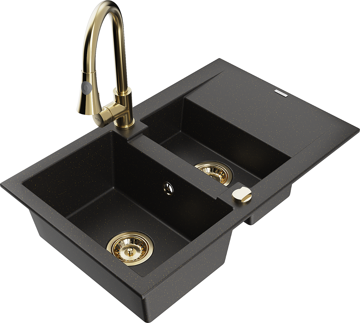 Mexen Gaspar гранитна мивка 1,5-коморна с отцедник и кухненски смесител Elia, черен/златист металик - 6507-75-670101-50