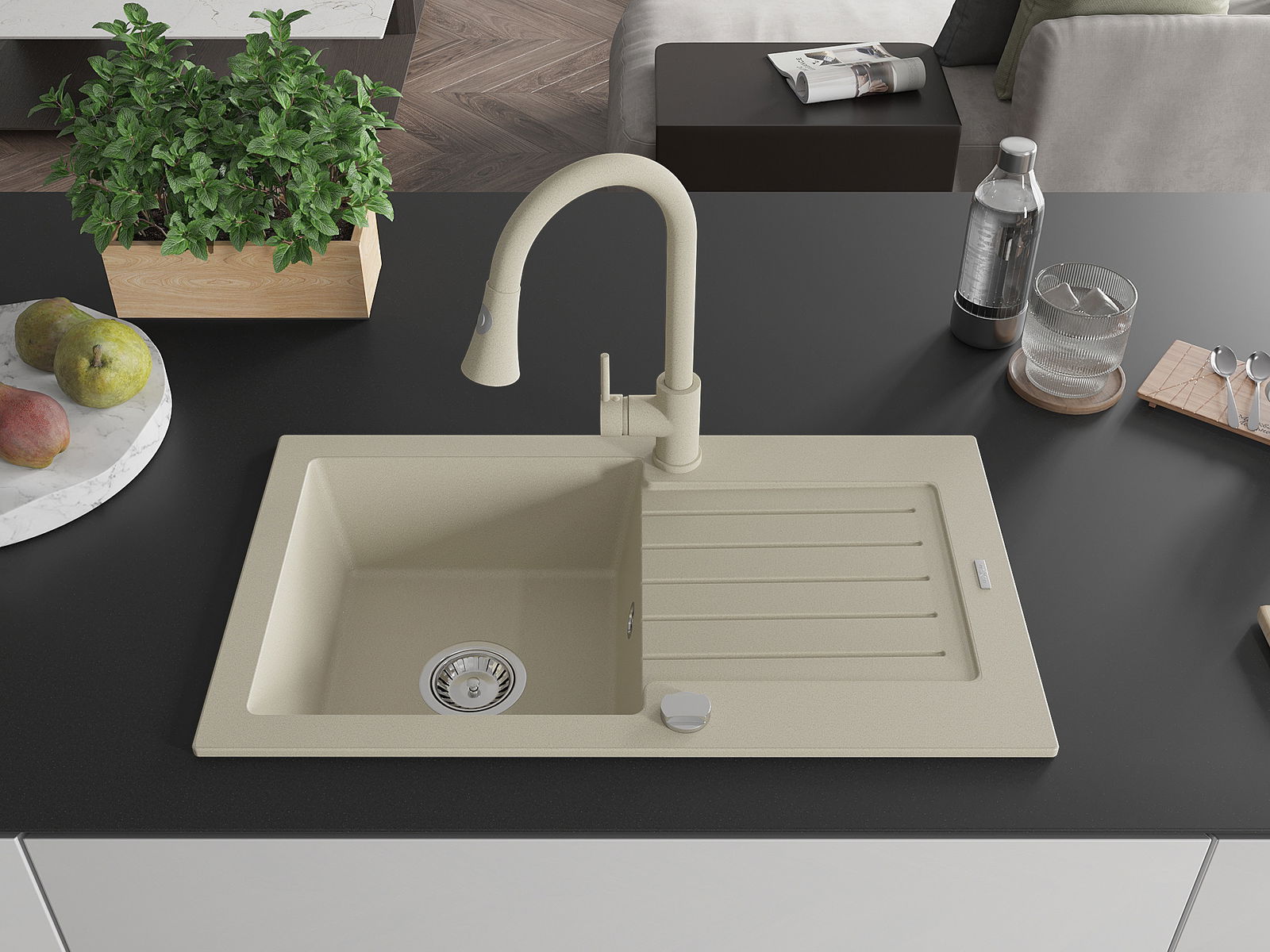 Гранитна кухненска мивка Mexen Pablo с една камера и отцедник и кухненски смесител Elia, бежов - 6510-69-670101-69