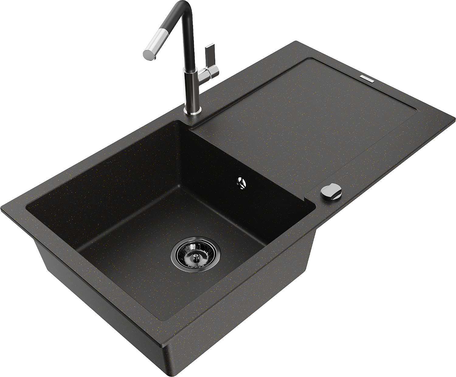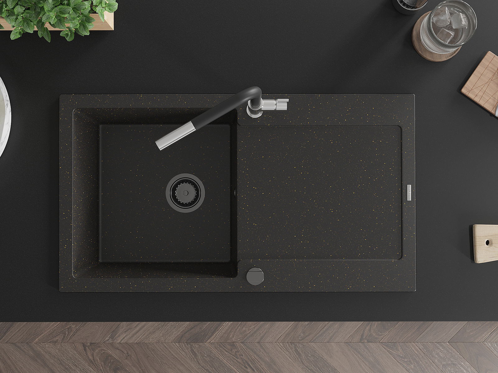 Mexen Leo гранитна кухненска мивка с 1 корито с отцедник и кухненски смесител Flora, черен/златен металик - 6501-75-670401-07-B