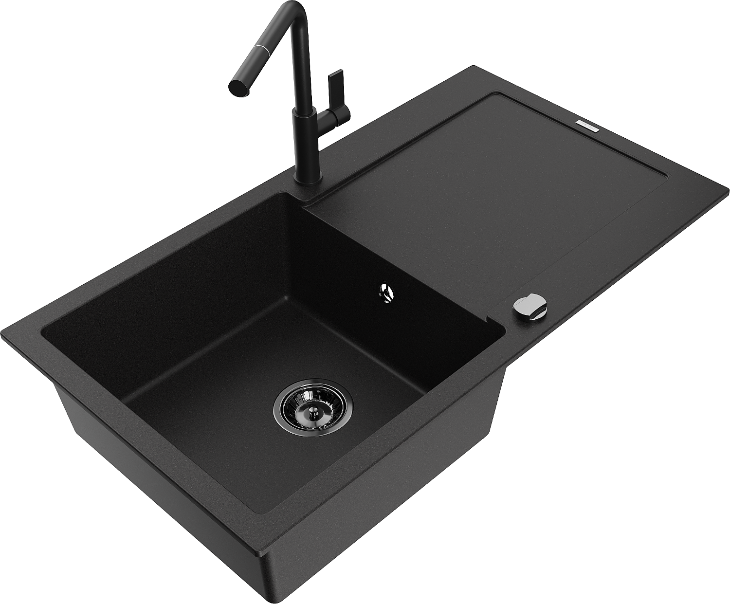 Мивка от гранит Mexen Leo с една камера с отцедник и кухненски смесител Flora, черен - 6501-77-670401-70-B