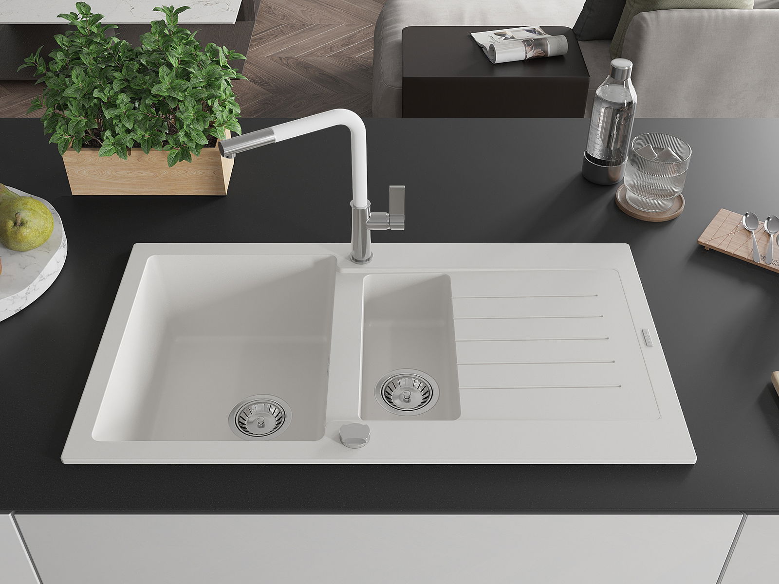 Mexen Matias гранитна мивка 1,5-коморна със сушилник и кухненски смесител Flora, бял - 6502-20-670401-02