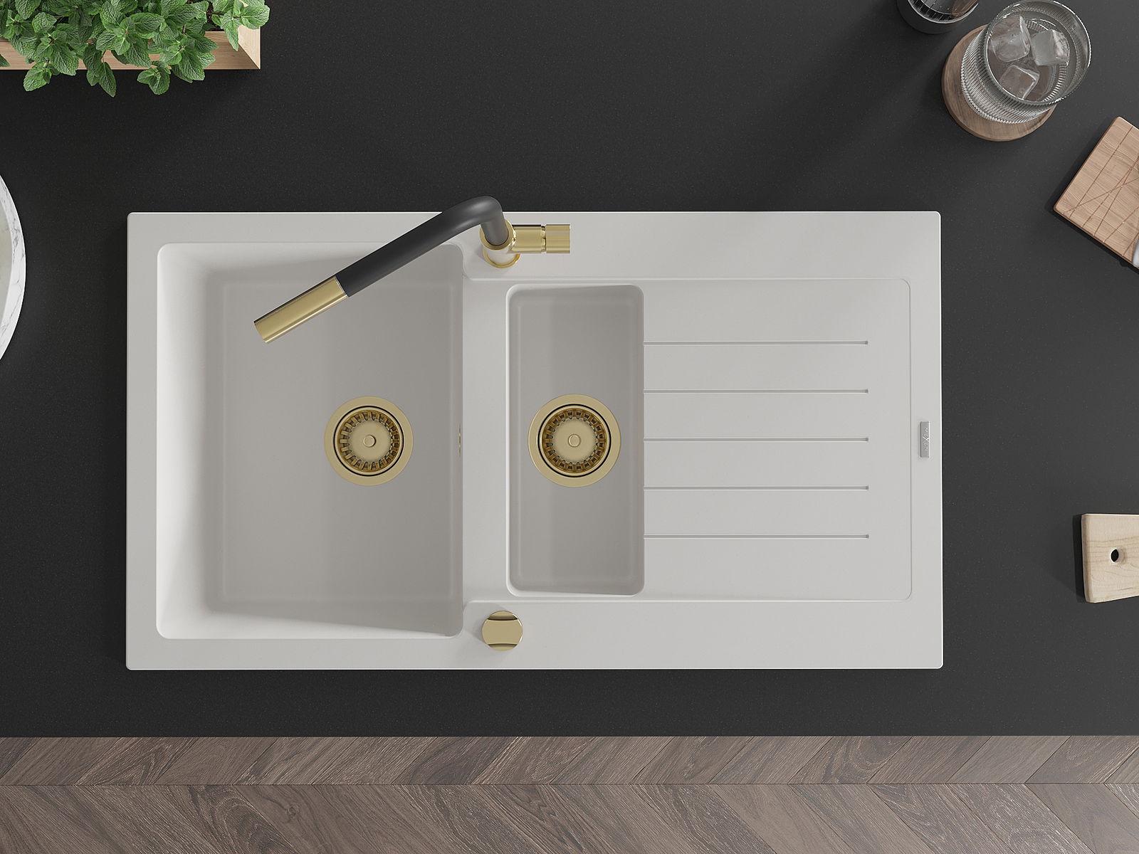 Mexen Matias гранитна мивка с 1,5 камери, с отцедник и кухненски смесител Flora, бял - 6502-20-670401-57-G