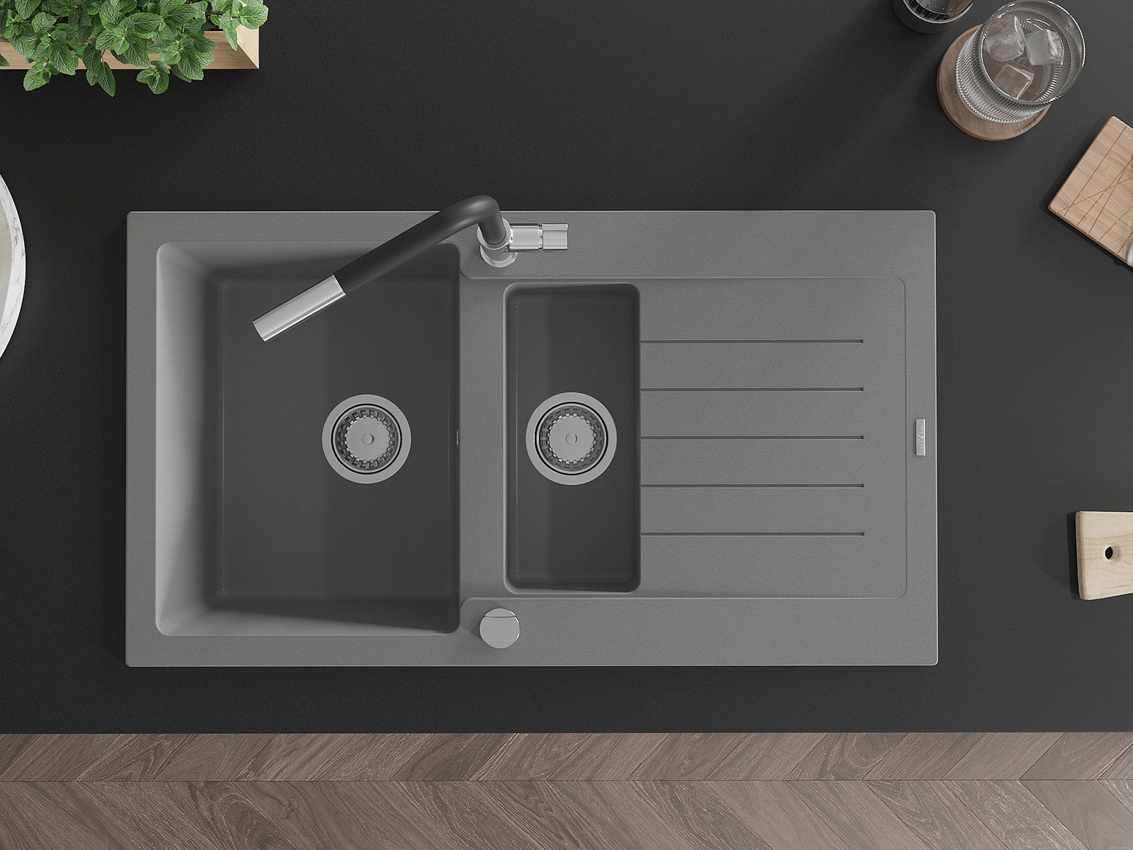 Mexen Matias Гранитна мивка 1,5-коморна с отцедник и кухненски смесител Flora, сива - 6502-71-670401-07