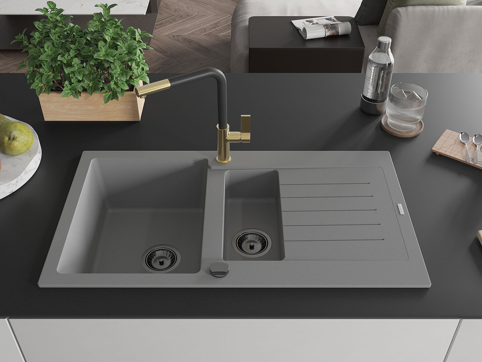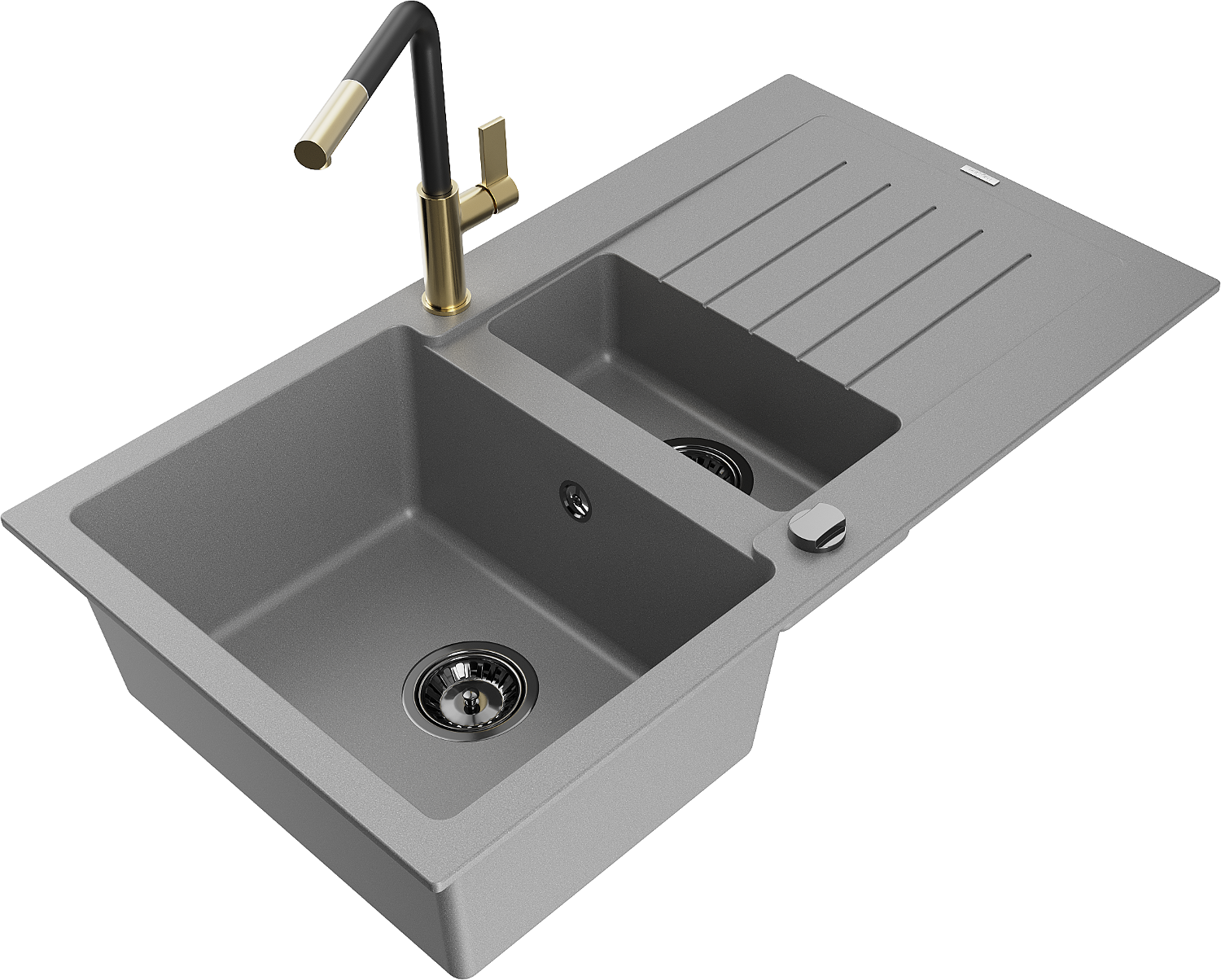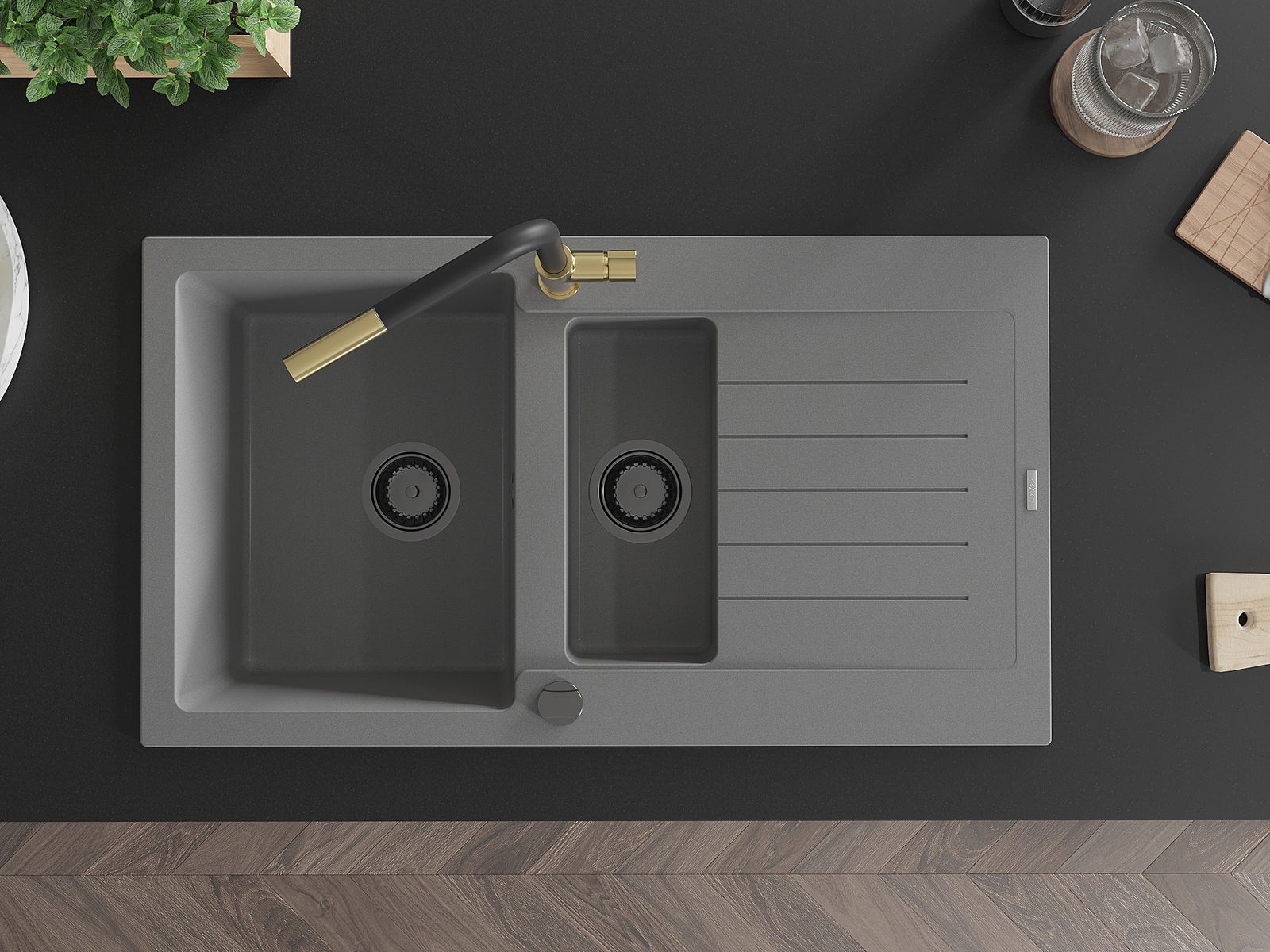 Mexen Matias мивка от гранит 1,5-камерна с капак и кухненски кран Flora, сив - 6502-71-670401-57-B