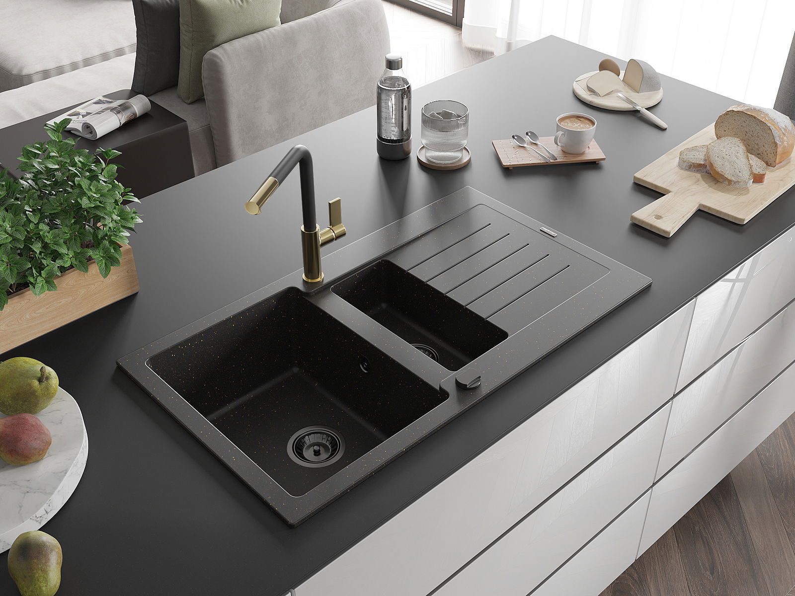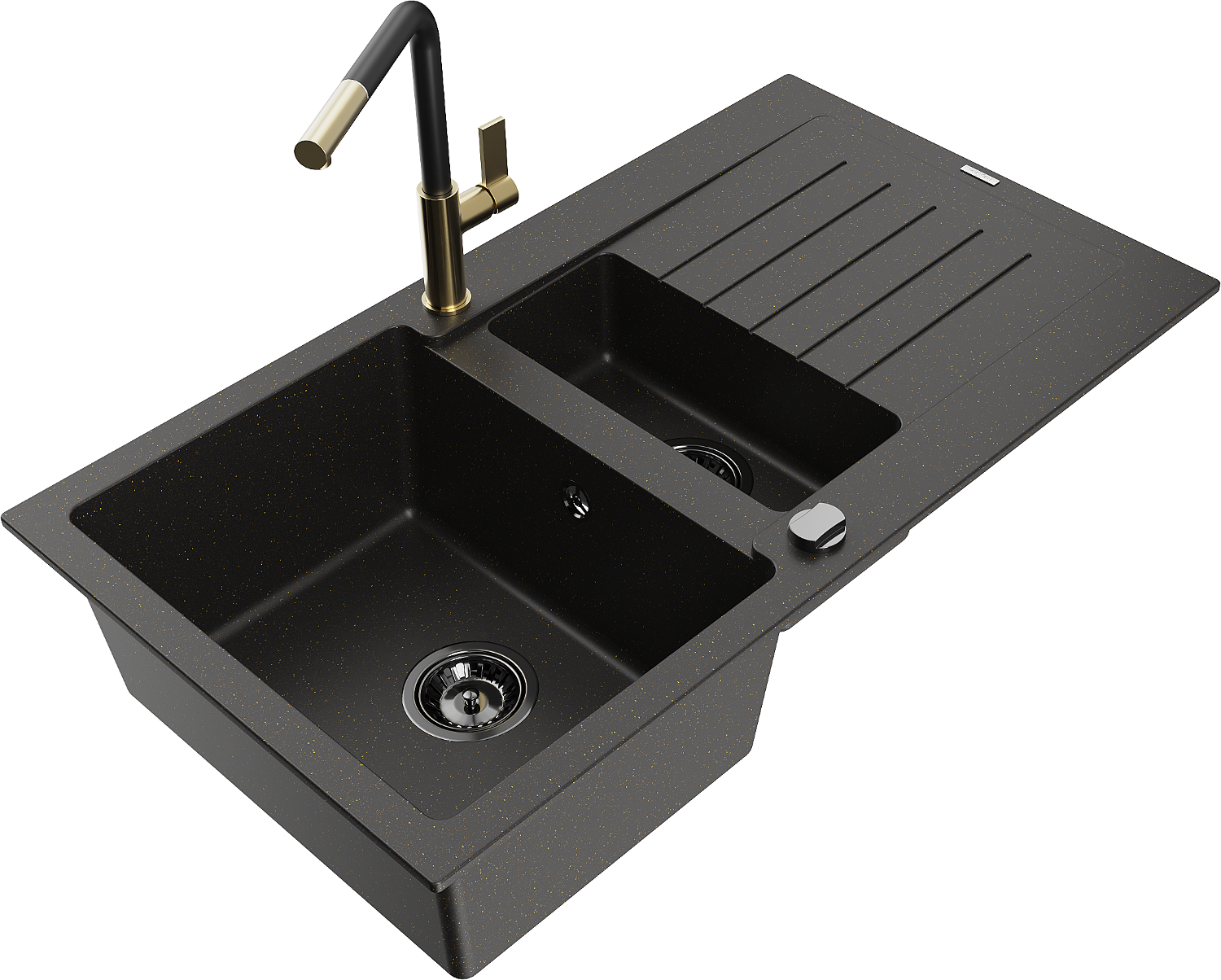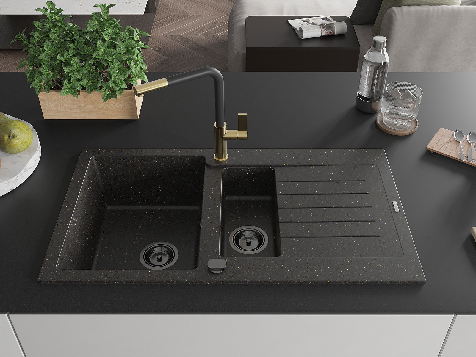 Mexen Matias Гранитна мивка с 1,5 камери с оцедник и кухненски смесител Flora, черен/златен - 6502-75-670401-57-B