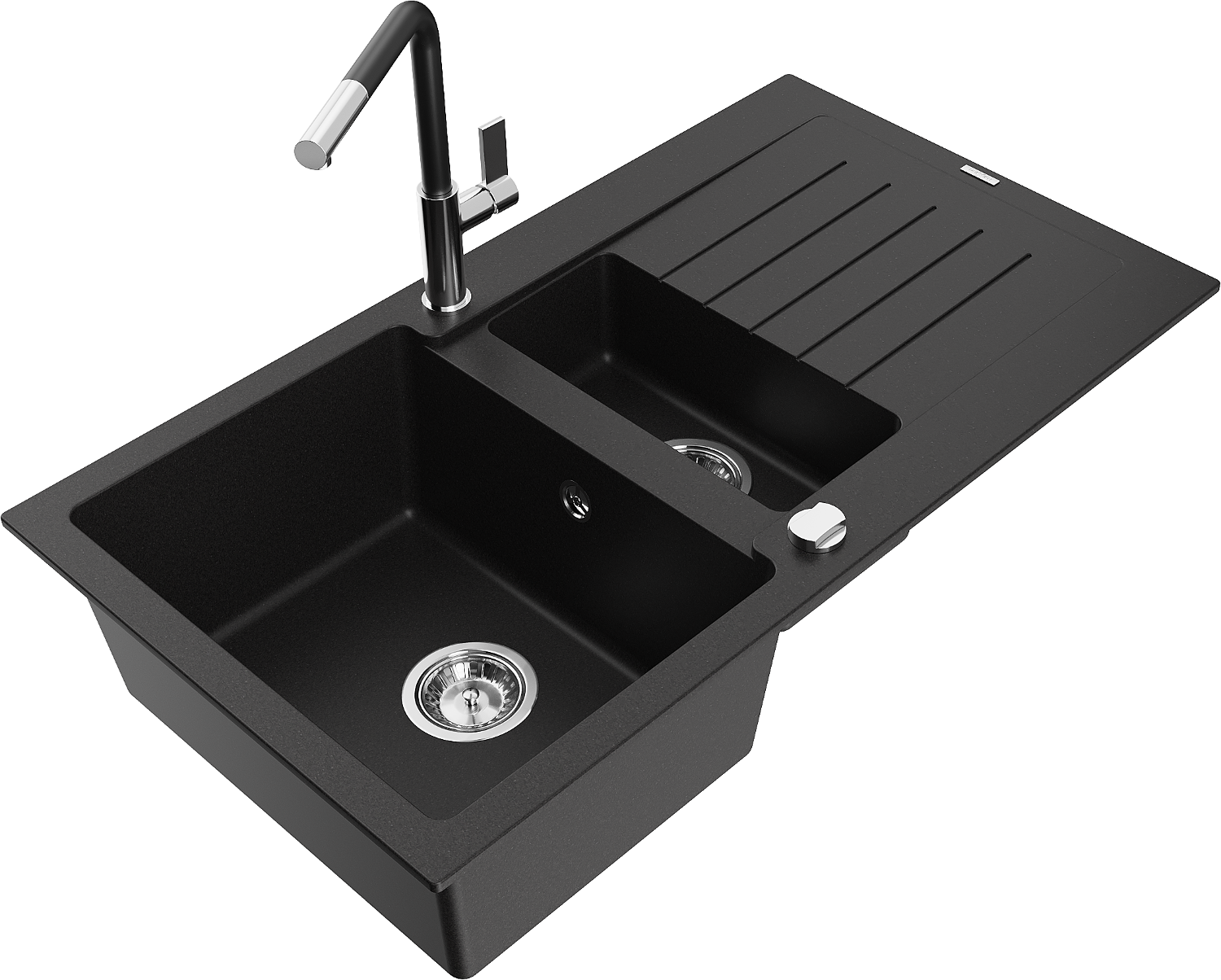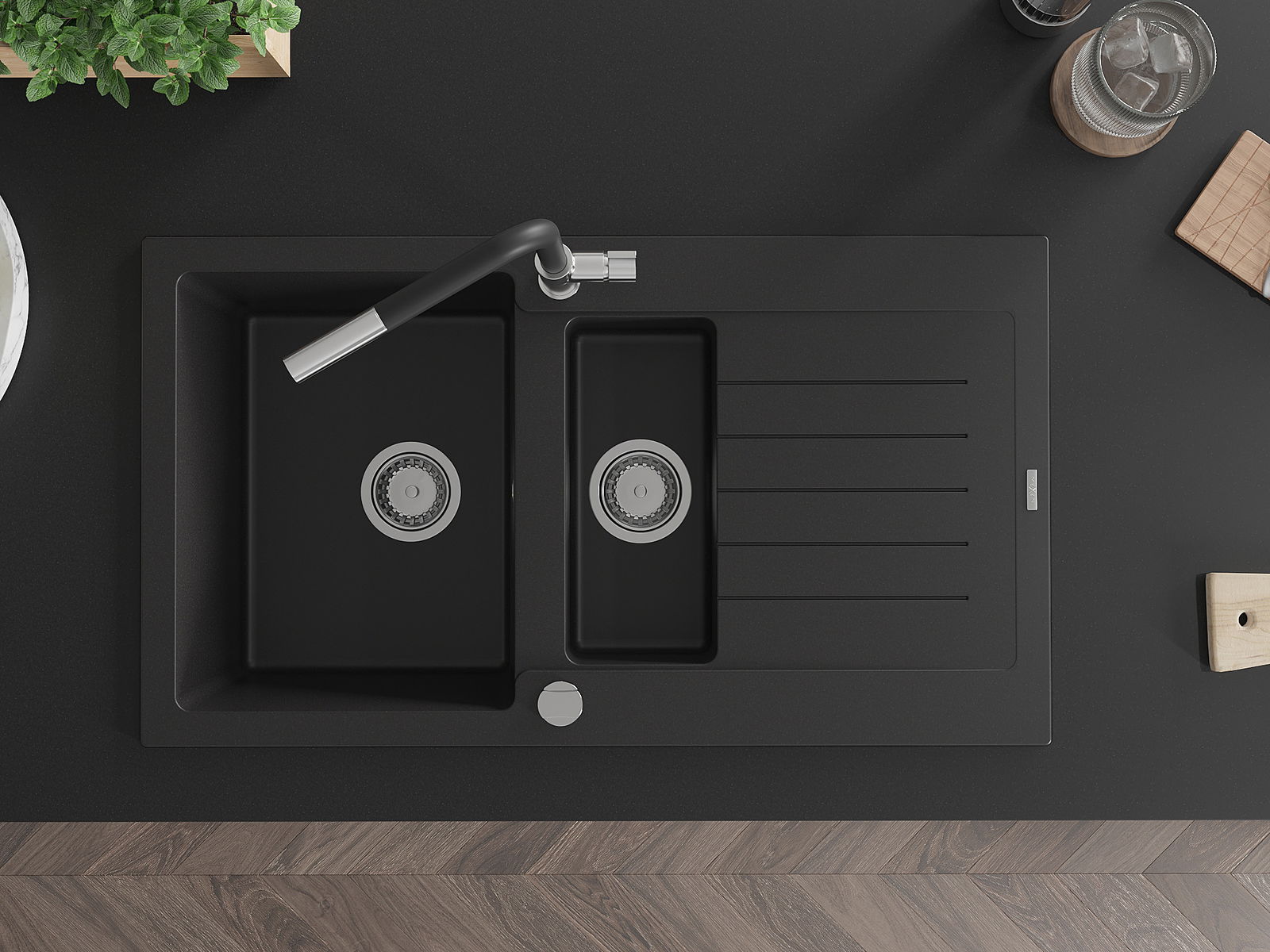 Mexen Matias Гранитна мивка с 1,5 камери с отцедник и кухненски смесител Flora, черна - 6502-77-670401-07