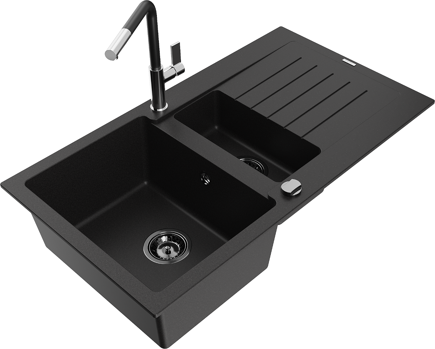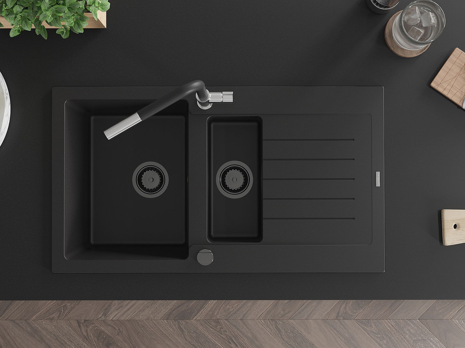 Mexen Matias гранитна мивка 1,5-коморова със сушилник и кухненски смесител Flora, черен - 6502-77-670401-07-B
