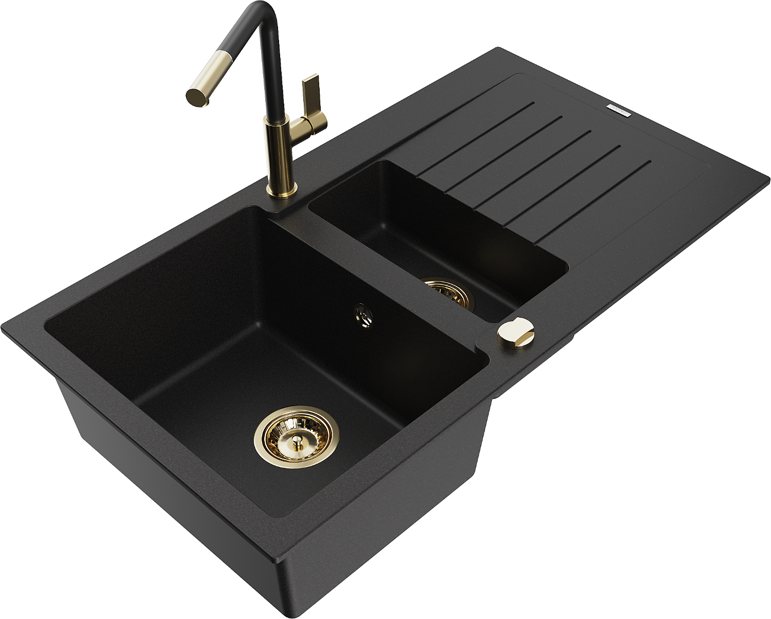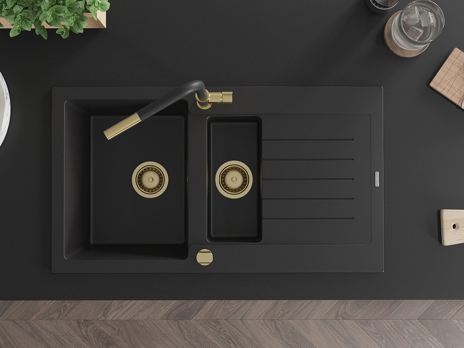 Mexen Matias гранитна мивка с 1,5 камери с отцедник и кухненски смесител Flora, черен - 6502-77-670401-57-G