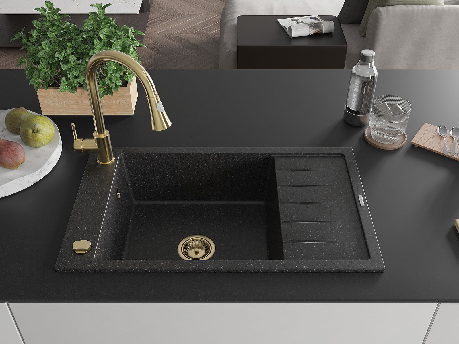 Мивката е направена от висококачествен гранит. Това е елегантно и най -вече практично допълнение към всяка кухня, независимо от нейния стил. Висококачествената и гранитна издръжливост осигуряват много години употреба.