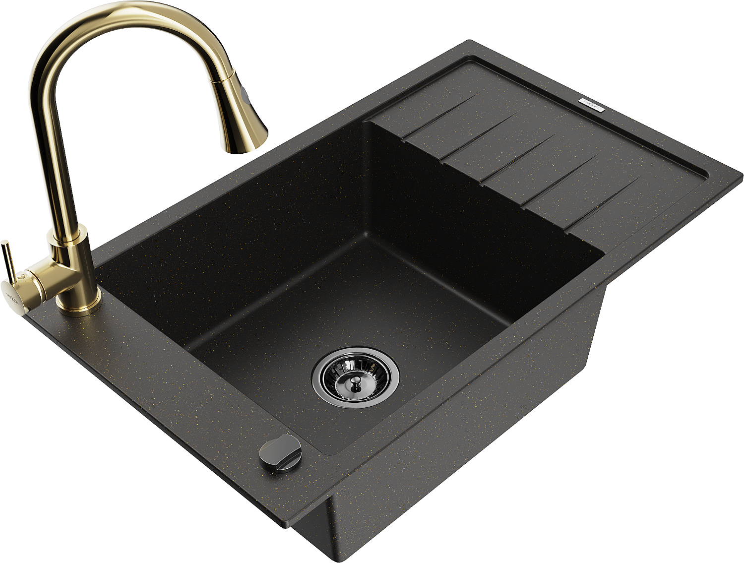 Mexen Elias гранитна кухненска мивка с една камера и сушилня и кухненски смесител Elia, черен/златен металик - 6511-75-670101-5?