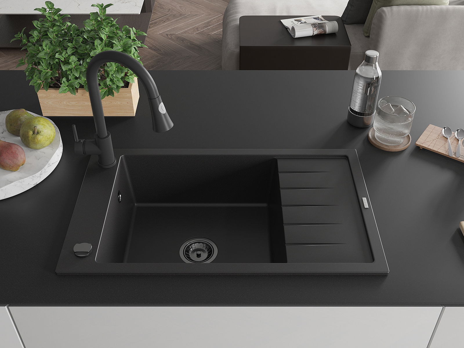 Мивката е направена от висококачествен гранит. Това е елегантно и най -вече практично допълнение към всяка кухня, независимо от нейния стил. Висококачествената и гранитна издръжливост осигуряват много години употреба.