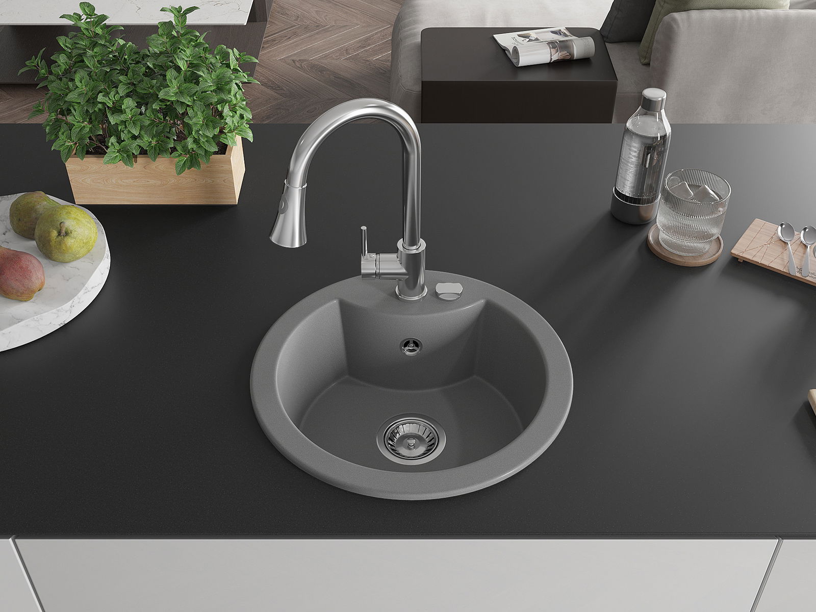 Мивката е направена от висококачествен гранит. Това е елегантно и най -вече практично допълнение към всяка кухня, независимо от нейния стил. Висококачествената и гранитна издръжливост осигуряват много години употреба.